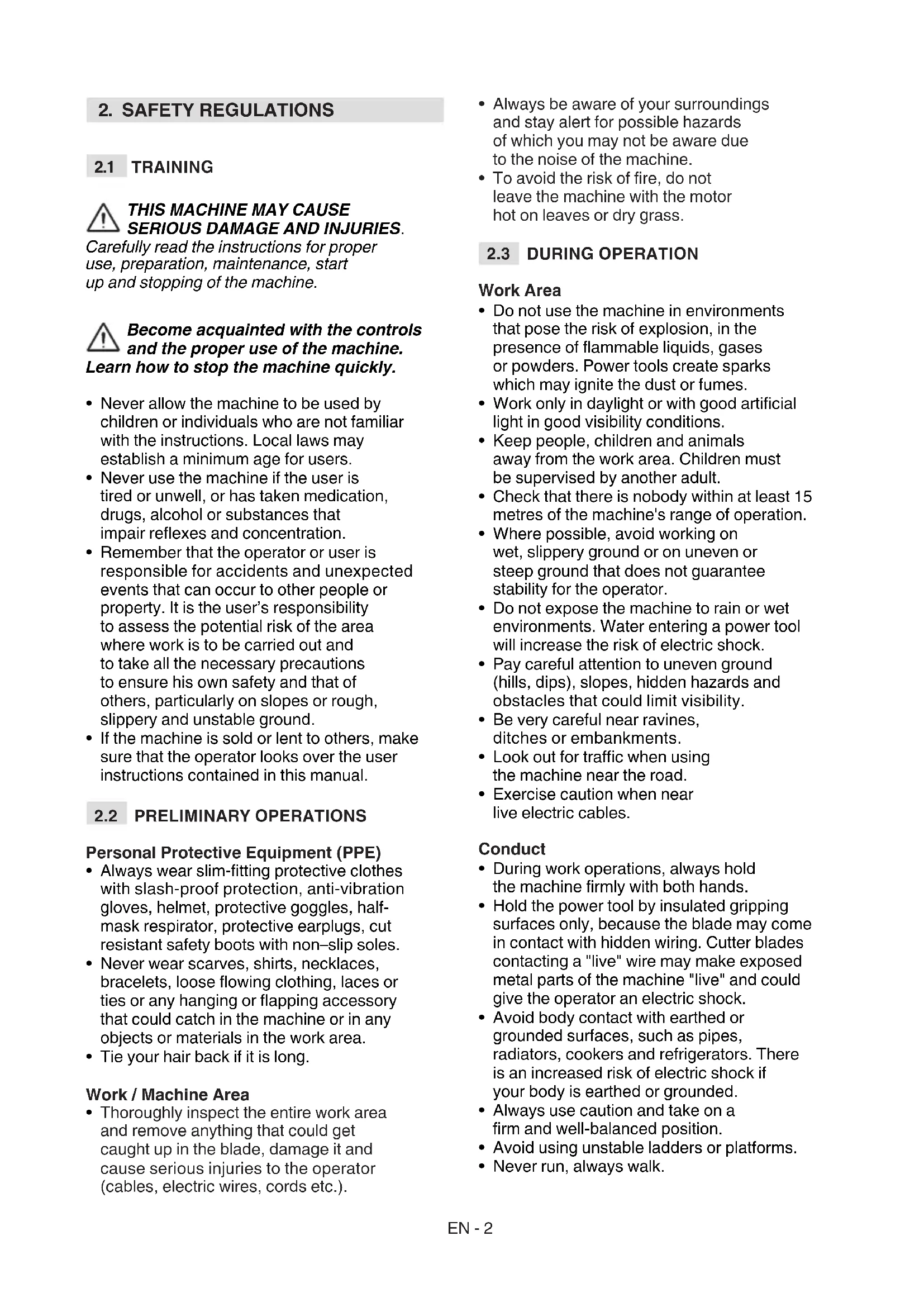 SERIOUS DAMAGE AND INJURIES. Carefully read the instructions for proper use, preparation, maintenance, start up and stopping of the machine. Become acquainted with the controls and the proper use of the machine. Learn how to stop the machine quickly.