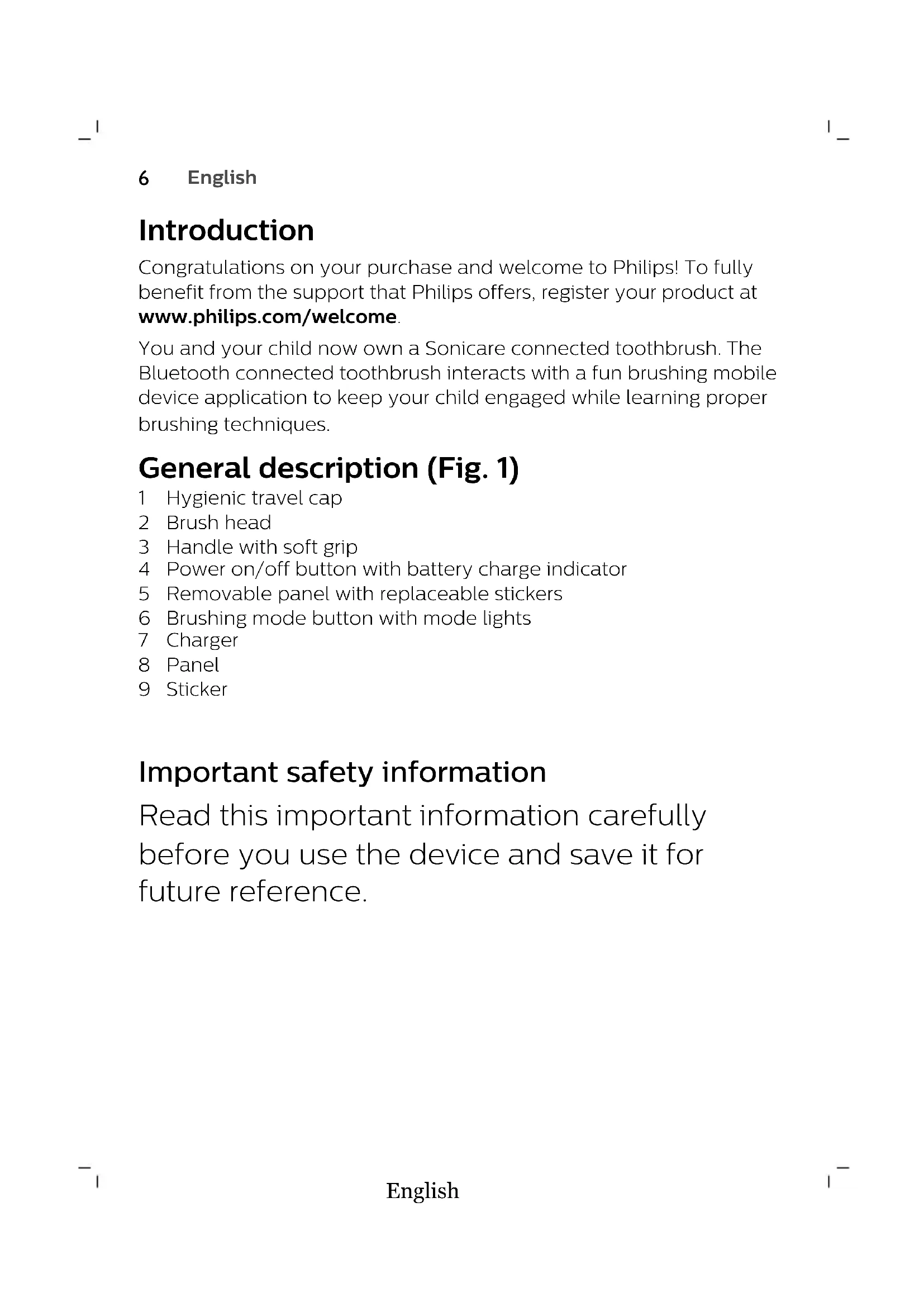104English Introduction Congratulations on your purchase and welcome to Philips! To fully benefit from the support that Philips offers, register your product at www.philips.com/welcome. You and your child now own a Sonicare connected toothbrush. The Bluetooth connected toothbrush interacts with a fun brushing mobile device application to keep your child engaged while learning proper brushing techniques. General description (Fig. 1) 1 Hygienic travel cap 2 Brush head 3 Handle with soft grip 4 Power on/off button with battery charge indicator 5 Removable panel with replaceable stickers 6 Brushing mode button with mode lights 7 Charger 8 Panel 9 Sticker Important safety information Read this important information carefully before you use the device and save it for future reference.