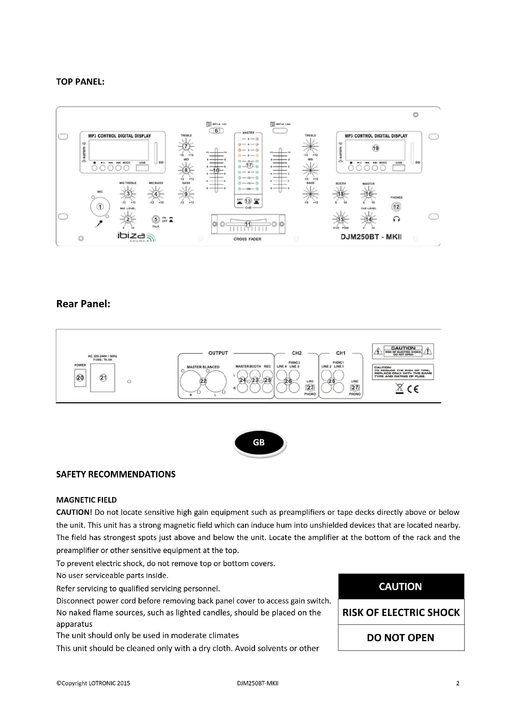 GB©Copyright LOTRONIC 2015 DJM250BT-MKII 3 cleaning detergents A minimum distance of 0.5m around the unit must be kept to ensure sufficient ventilation and avoid overheating WARNING! To reduce the risk of electric shock, do not expose this equipment to rain or moisture! The exclamation point triangle is used to alert the user to important operating or maintenance instructions The lightning bolt triangle is used to alert the user to the risk of electric shock Controls