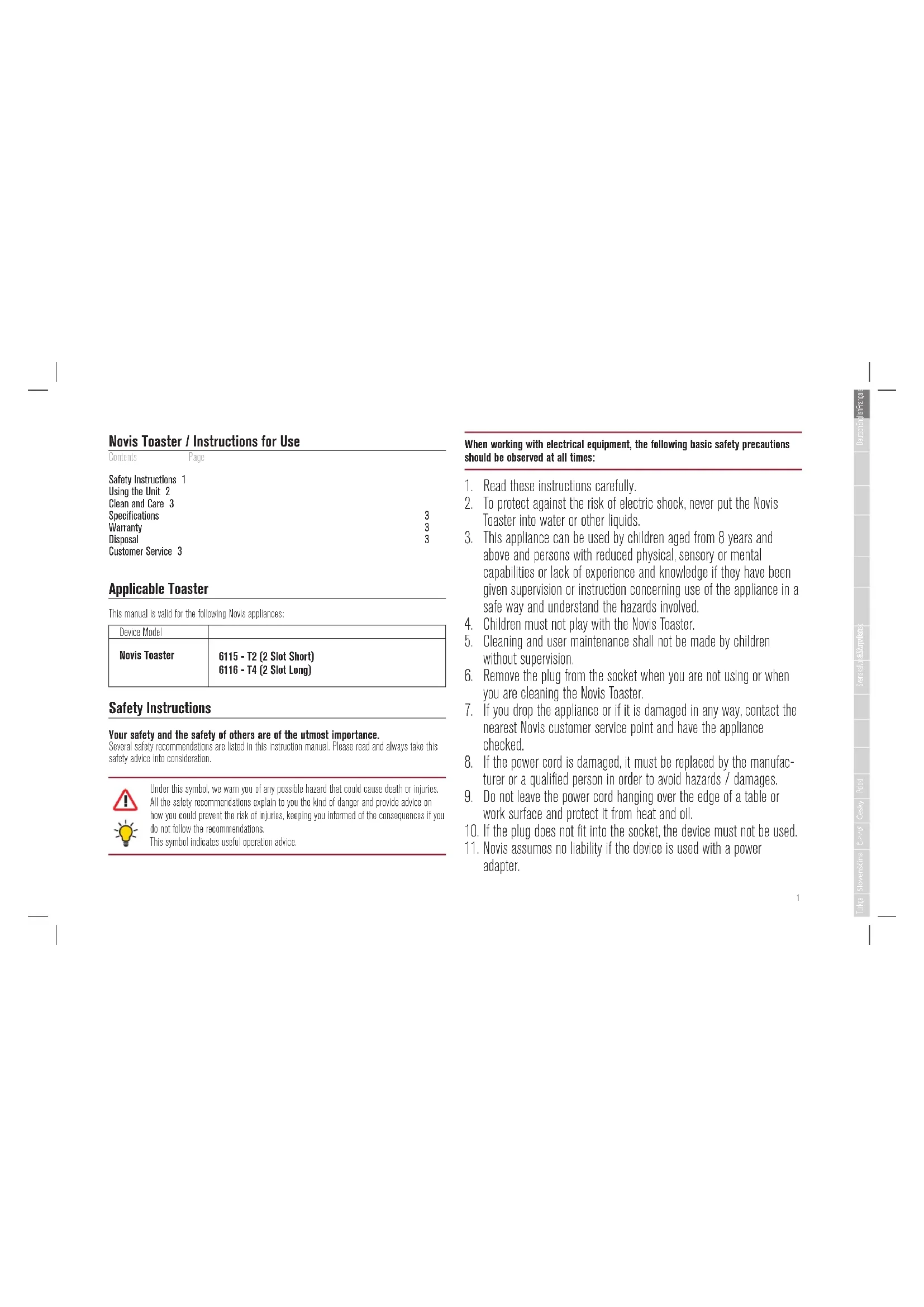 Novis Toaster / Instructions for Use Contents Page Safety Instructions 1 Using the Unit 2 Clean and Care 3 Specifications 3 Warranty 3 Disposal 3 Customer Service 3 Applicable Toaster This manual is valid for the following Novis appliances: Device Model Novis Toaster 6115 - T2 (2 Slot Short) 6116 - T4 (2 Slot Long) Safety Instructions Your safety and the safety of others are of the utmost importance. Several safety recommendations are listed in this instruction manual. Please read and always take this safety advice into consideration. Under this symbol, we warn you of any possible hazard that could cause death or injuries. All the safety recommendations explain to you the kind of danger and provide advice on how you could prevent the risk of injuries, keeping you informed of the consequences if you do not follow the recommendations. This symbol indicates useful operation advice. When working with electrical equipment, the following basic safety precautions should be observed at all times: