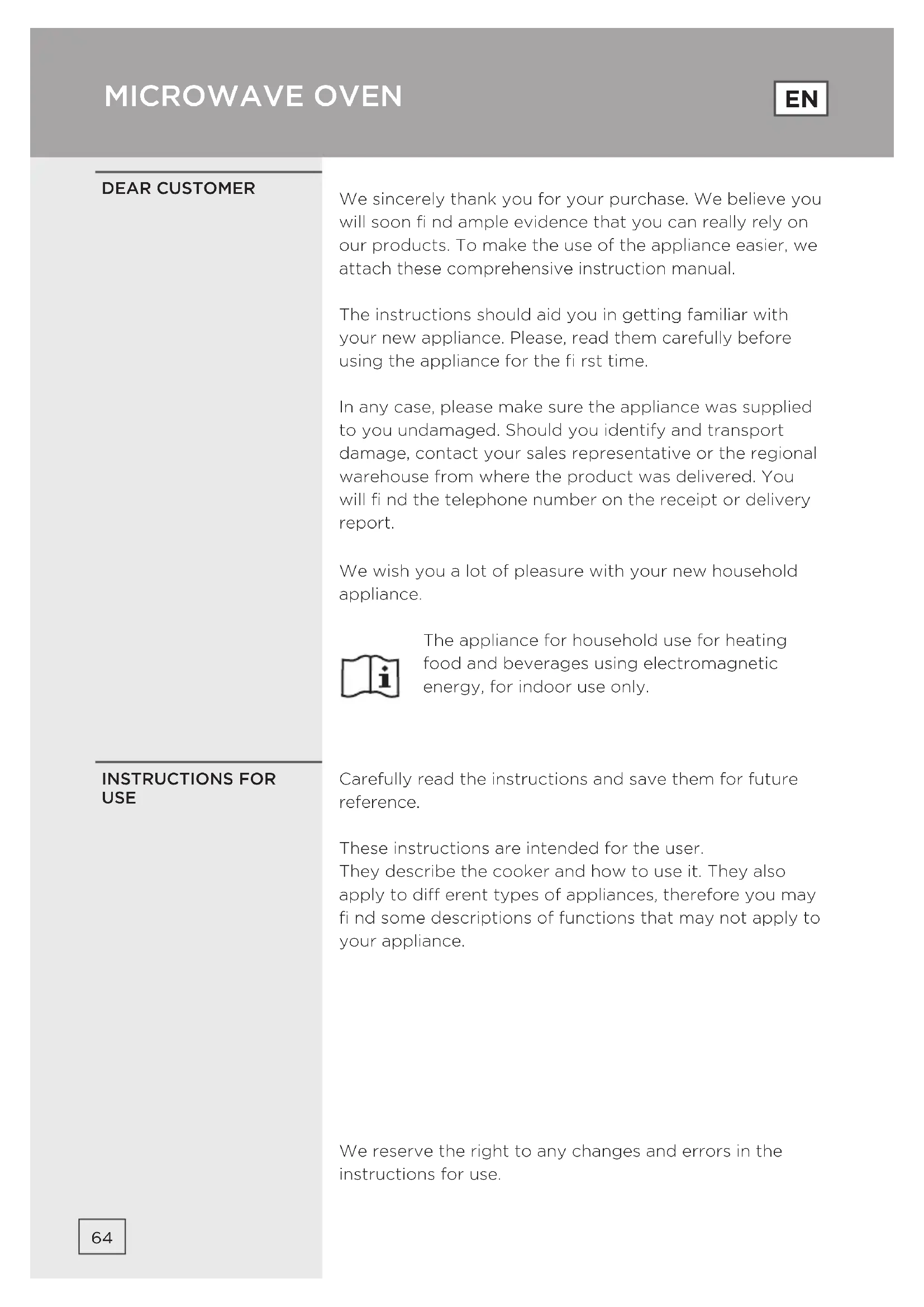 a) Check to see whether the timer is set. b) Check to make sure that the door is securely closed to engage the safety interlocks. Otherwise, the microwave energy will not fl ow into the oven. If none of the above rectify the situation, then contact the nearest authorized service agent. The appliance for household use for heating food and beverages using electromagnetic energy, for indoor use only. If you need information or if you have a problem, please contact the Gorenje Customer Care Centre in your country (you fi nd its phone number in the worldwide guarantee leafl et). If there is no Customer Care Centre in your country, go to your local Gorenje dealer or contact the Service department of Gorenje domestic appliances. Eventual mismatches in colour shades between di erent appliances or components within a single design line may occur due to various factors, such as di erent angles under which the appliances are observed, di erent coloured backgrounds, materials, and room illumination. For personal use only! Additional recommendations for cooking with microwave and useful advices can be found on web side: http://www.gorenje.com WISHES YOU A LOT OF PLEASURE WHILE USING YOUR APPLIANCE