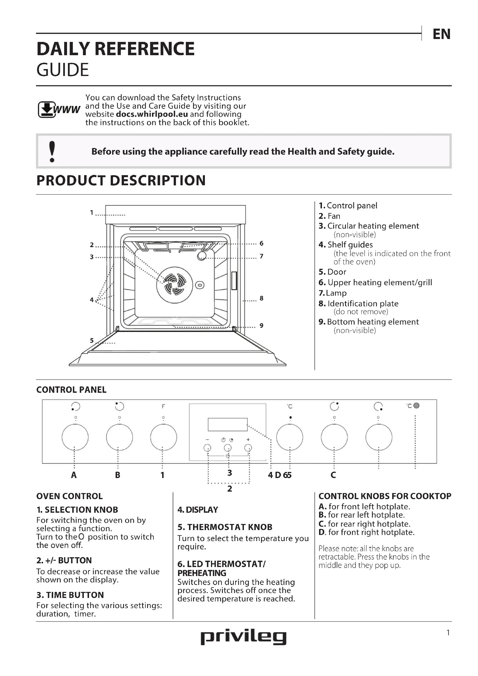 A. for front left hotplate.B. for rear left hotplate.C. for rear right hotplate.D. for front right hotplate.Please note: all the knobs are retractable. Press the knobs in the middle and they pop up. DAILY REFERENCE GUIDE Before using the appliance carefully read the Health and Safety guide. WWW You can download the Safety Instructions and the Use and Care Guide by visiting our website docs.whirlpool.eu and following the instructions on the back of this booklet.