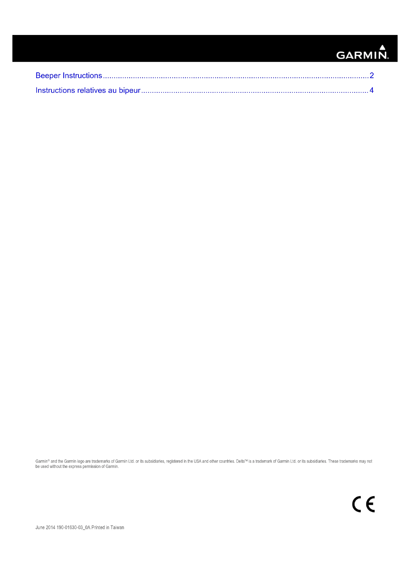 and the Garmin logo are trademarks of Garmin Ltd. or its subsidiaries, registered in the USA and other countries. Delta™ is a trademark of Garmin Ltd. or its subsidiaries. These trademarks may not be used without the express permission of Garmin. June 2014 190-01630-03_0A Printed in TaiwanBeeper Instructions Beeper Device Overview