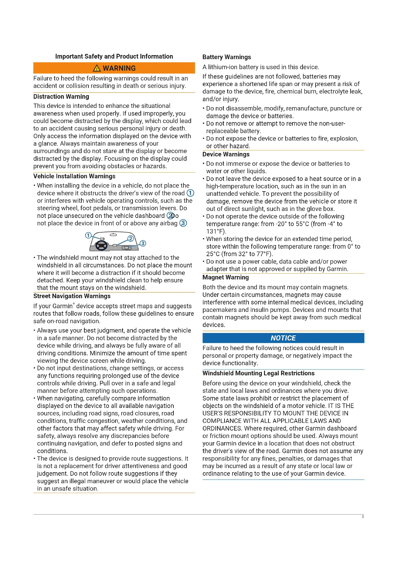 INFORMATION © 2021 Garmin Ltd. or its subsidiaries GUID-AF17F60C-F9D9-404C-B64A-59857F23057F v4June 2021Important Safety and Product Information 3 Informations importantes sur le produit et la sécurité 7 guida Informazioni importanti sulla sicurezza e sul prodotto 11 Wichtige Sicherheits- und Produktinformationen 14 Información importante sobre el producto y tu seguridad 18 Informações importantes de segurança e do produto 22 Belangrijke veiligheids- en productinformatie 25 Vigtige produkt- og sikkerhedinformationer 28 Tärkeitä turvallisuus- ja tuotetietoja 31 Viktig sikkerhets- og produktinformasjon 34 Guiden Viktig säkerhets- och produktinformation 37 Ważne informacje dotyczące bezpieczeństwa i produktu 40 Důležité bezpečnostní informace a informace o produktu 44 Pomembne informacije o varnosti in izdelku 47 Dôležité informácie o bezpečnosti a produkte 50 Правила техники безопасности и сведения об изделии 53 Važne informacije o proizvodu i sigurnosti 57 Fontos biztonsági és terméktudnivalók 60Important Safety and Product Information WARNING Failure to heed the following warnings could result in an accident or collision resulting in death or serious injury. Distraction Warning This device is intended to enhance the situational awareness when used properly. If used improperly, you could become distracted by the display, which could lead to an accident causing serious personal injury or death. Only access the information displayed on the device with a glance. Always maintain awareness of your surroundings and do not stare at the display or become distracted by the display. Focusing on the display could prevent you from avoiding obstacles or hazards. Vehicle Installation Warnings