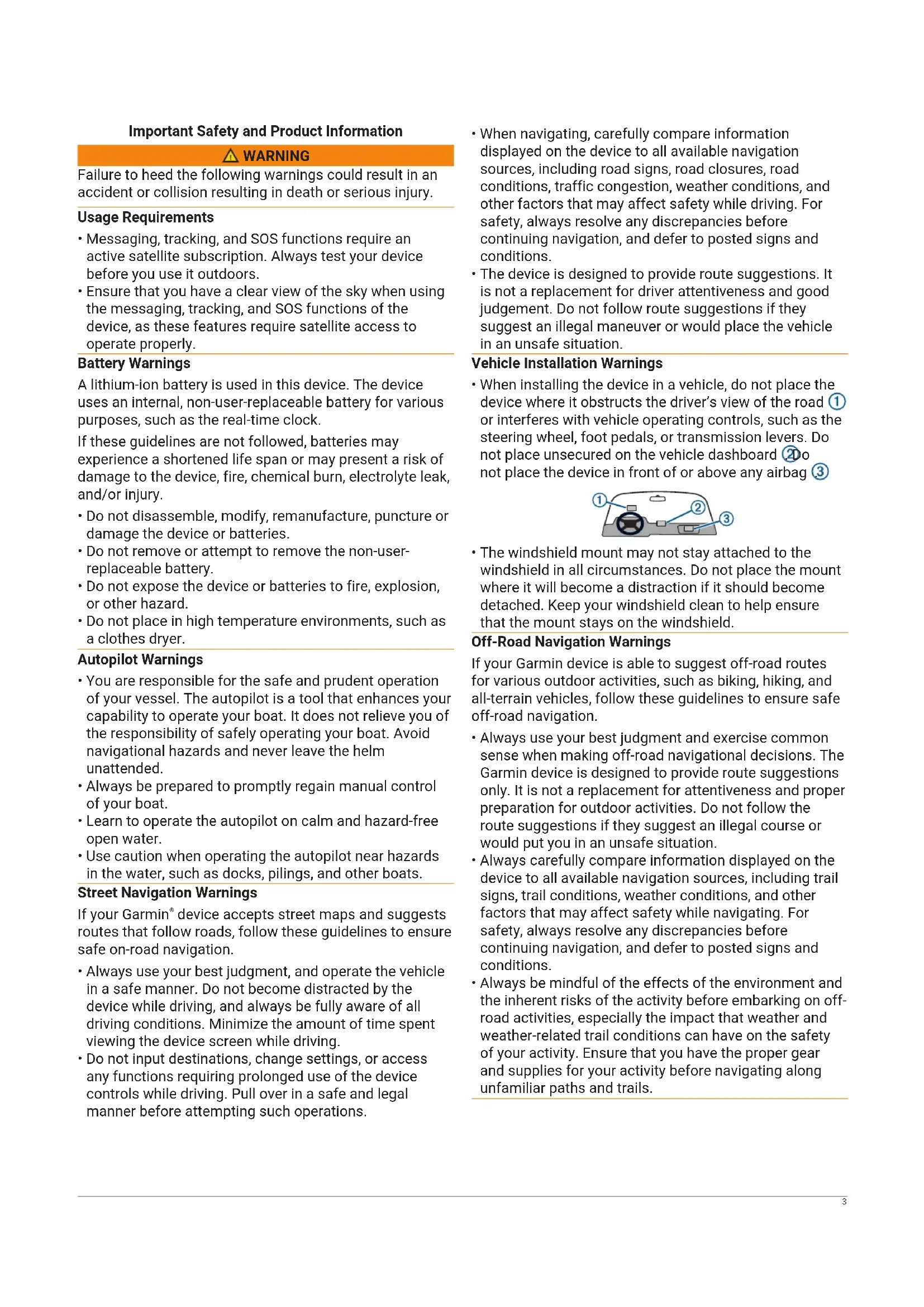 INFORMATION © 2019 Garmin Ltd. or its subsidiaries GUID-6AB6F8AF-CEA3-4C57-82A3-0C086782B334 v2May 2021Important Safety and Product Information 3 Informations importantes sur le produit et la sécurité 7 guida Informazioni importanti sulla sicurezza e sul prodotto 11 Wichtige Sicherheits- und Produktinformationen 15 Información importante sobre el producto y tu seguridad 19 Informações importantes sobre segurança e sobre o produto 23 Důležité bezpečnostní informace a informace o produktu 27 Правила техники безопасности и сведения об изделии 30 Važne informacije o proizvodu i sigurnosti 34 Ważne informacje dotyczące bezpieczeństwa i produktu 37 Pomembne informacije o varnosti in izdelku 41 Vigtige produkt- og sikkerhedinformationer 44 Tärkeitä turvallisuus- ja tuotetietoja 47 Viktig sikkerhets- og produktinformasjon 50 Belangrijke veiligheids- en productinformatie 53 Guiden Viktig säkerhets- och produktinformation 57Important Safety and Product Information WARNING Failure to heed the following warnings could result in an accident or collision resulting in death or serious injury. Usage Requirements