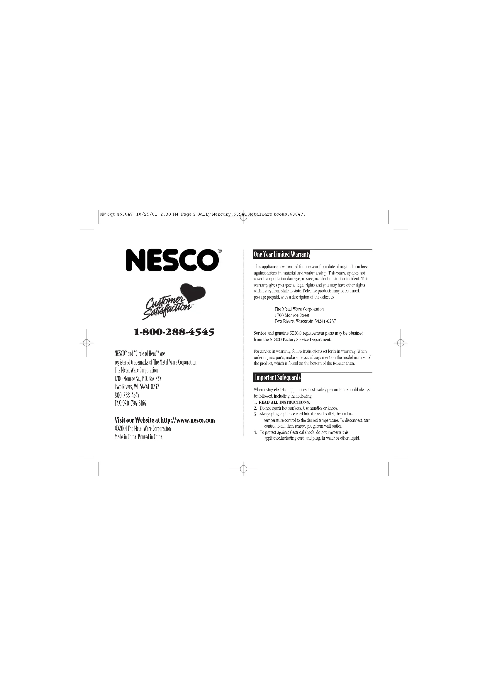 Visit our Website at http://www.nesco.com ©2001 The Metal Ware Corporation Made in China. Printed in China. One Year Limited Warranty This appliance is warranted for one year from date of original purchase against defects in material and workmanship. This warranty does not cover transportation damage, misuse, accident or similar incident. This warranty gives you special legal rights and you may have other rights which vary from state to state. Defective products may be returned, postage prepaid, with a description of the defect to: The Metal Ware Corporation 1700 Monroe Street Two Rivers, Wisconsin 54241-0237 Service and genuine NESCO replacement parts may be obtained from the NESCO Factory Service Department. For service in warranty, follow instructions set forth in warranty. When ordering new parts, make sure you always mention the model number of the product, which is found on the bottom of the Roaster Oven. Important Safeguards When using electrical appliances, basic safety precautions should always be followed, including the following: