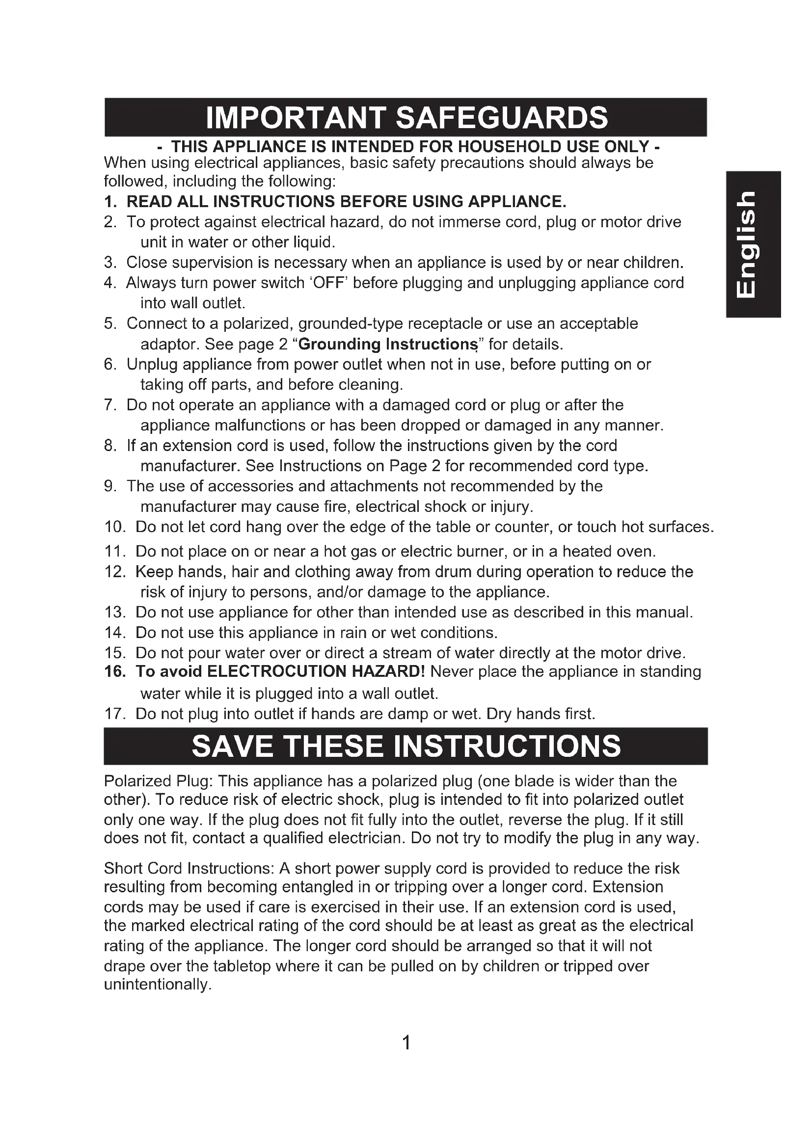English IMPORTANT SAFEGUARDS - THIS APPLIANCE IS INTENDED FOR HOUSEHOLD USE ONLY - When using electrical appliances, basic safety precautions should always be followed, including the following: