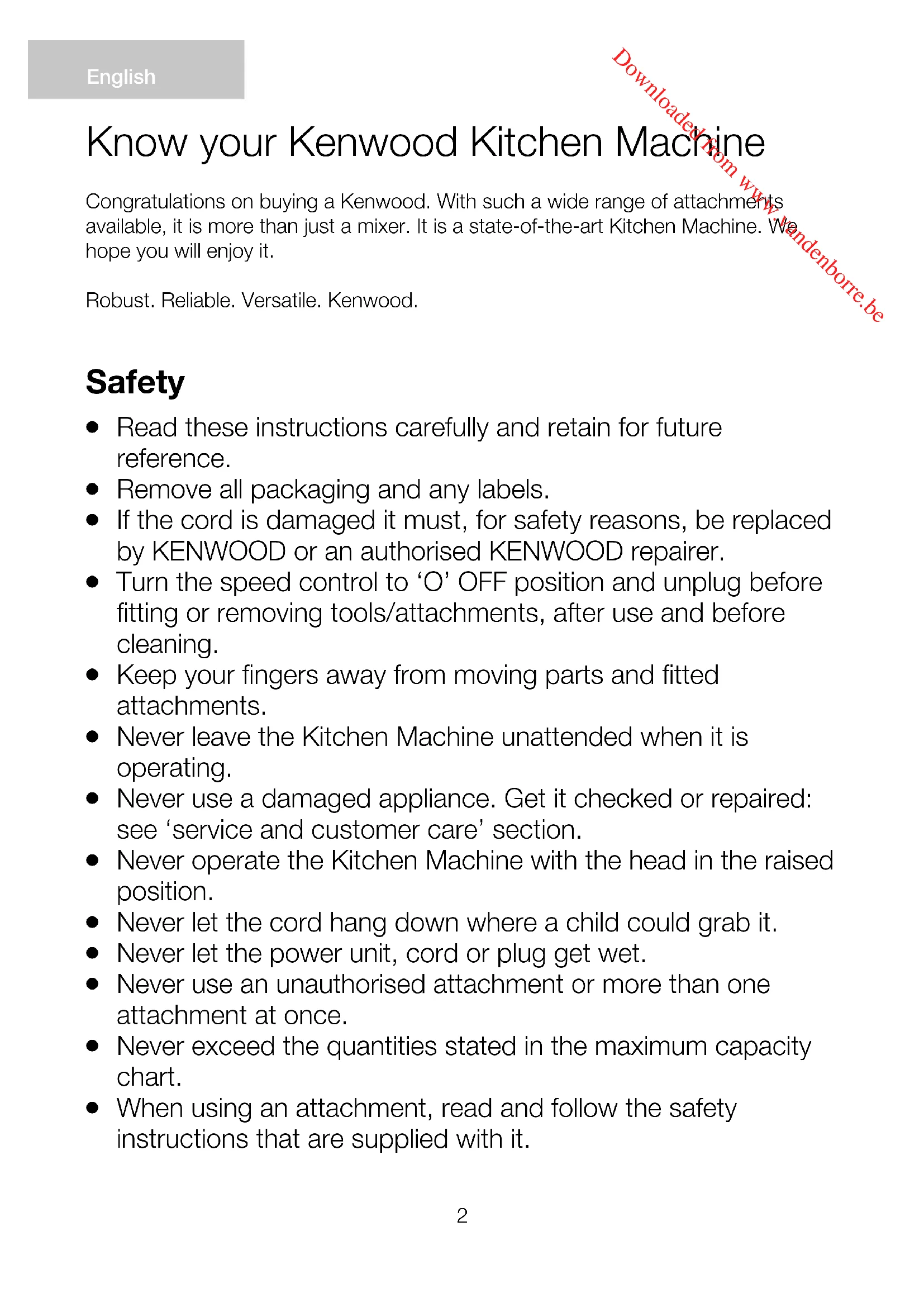 Downloaded from www.vandenborre.beKnow your Kenwood Kitchen Machine Congratulations on buying a Kenwood. With such a wide range of attachments available, it is more than just a mixer. It is a state-of-the-art Kitchen Machine. We hope you will enjoy it. Robust. Reliable. Versatile. Kenwood.