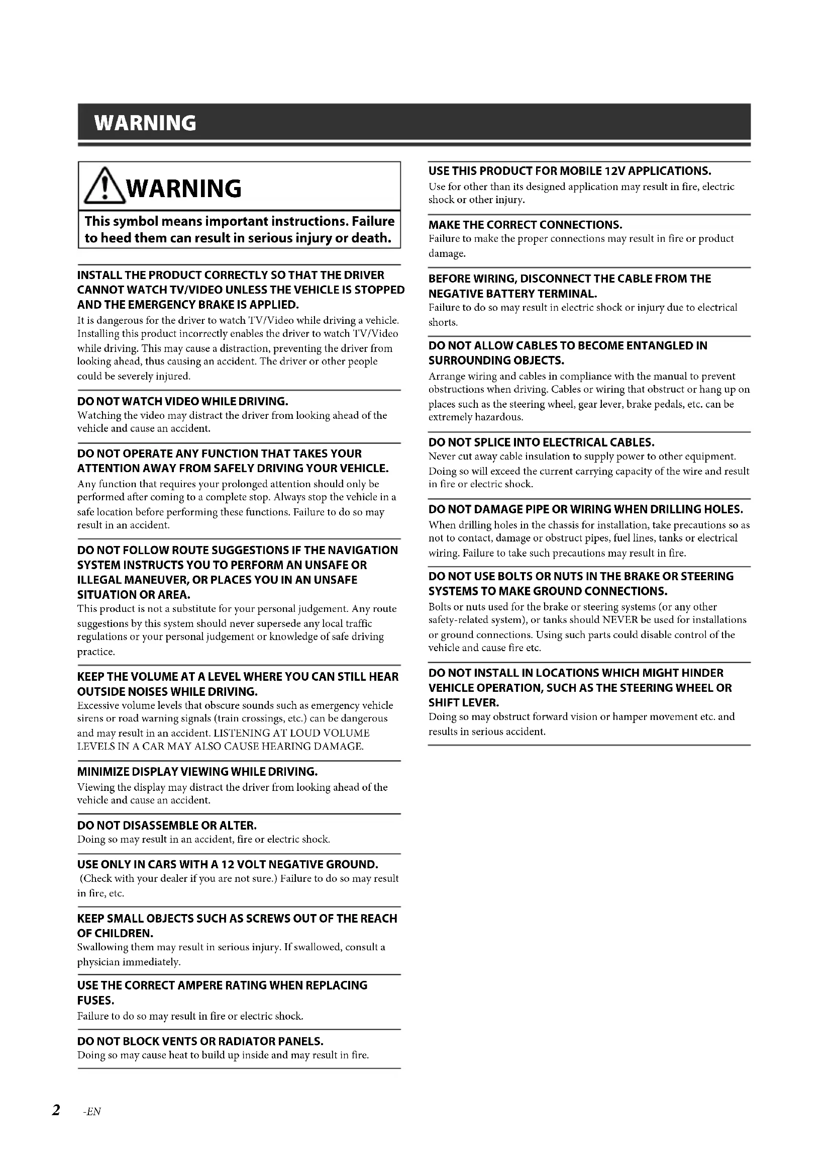- Specifications ALPINE X801D-U 68-29530Z16-A_QRG (EN) 2-EN WARNING WARNING This symbol means important instructions. Failure to heed them can result in serious injury or death. INSTALL THE PRODUCT CORRECTLY SO THAT THE DRIVER CANNOT WATCH TV/VIDEO UNLESS THE VEHICLE IS STOPPED AND THE EMERGENCY BRAKE IS APPLIED.It is dangerous for the driver to watch TV/Video while driving a vehicle. Installing this product incorrectly enables the driver to watch TV/Video while driving. This may cause a distraction, preventing the driver from looking ahead, thus causing an accident. The driver or other people could be severely injured.DO NOT WATCH VIDEO WHILE DRIVING.Watching the video may distract the driver from looking ahead of the vehicle and cause an accident.DO NOT OPERATE ANY FUNCTION THAT TAKES YOUR ATTENTION AWAY FROM SAFELY DRIVING YOUR VEHICLE.Any function that requires your prolonged attention should only be performed after coming to a complete stop. Always stop the vehicle in a safe location before performing these functions. Failure to do so may result in an accident.DO NOT FOLLOW ROUTE SUGGESTIONS IF THE NAVIGATION SYSTEM INSTRUCTS YOU TO PERFORM AN UNSAFE OR ILLEGAL MANEUVER, OR PLACES YOU IN AN UNSAFE SITUATION OR AREA.This product is not a substitute for your personal judgement. Any route suggestions by this system should never supersede any local traffic regulations or your personal judgement or knowledge of safe driving practice.KEEP THE VOLUME AT A LEVEL WHERE YOU CAN STILL HEAR OUTSIDE NOISES WHILE DRIVING.Excessive volume levels that obscure sounds such as emergency vehicle sirens or road warning signals (train crossings, etc.) can be dangerous and may result in an accident. LISTENING AT LOUD VOLUME LEVELS IN A CAR MAY ALSO CAUSE HEARING DAMAGE.MINIMIZE DISPLAY VIEWING WHILE DRIVING.Viewing the display may distract the driver from looking ahead of the vehicle and cause an accident.DO NOT DISASSEMBLE OR ALTER.Doing so may result in an accident, fire or electric shock.USE ONLY IN CARS WITH A 12 VOLT NEGATIVE GROUND. (Check with your dealer if you are not sure.) Failure to do so may result in fire, etc.KEEP SMALL OBJECTS SUCH AS SCREWS OUT OF THE REACH OF CHILDREN.Swallowing them may result in serious injury. If swallowed, consult a physician immediately.USE THE CORRECT AMPERE RATING WHEN REPLACING FUSES.Failure to do so may result in fire or electric shock.DO NOT BLOCK VENTS OR RADIATOR PANELS.Doing so may cause heat to build up inside and may result in fire.USE THIS PRODUCT FOR MOBILE 12V APPLICATIONS.Use for other than its designed application may result in fire, electric shock or other injury.MAKE THE CORRECT CONNECTIONS.Failure to make the proper connections may result in fire or product damage.BEFORE WIRING, DISCONNECT THE CABLE FROM THE NEGATIVE BATTERY TERMINAL.Failure to do so may result in electric shock or injury due to electrical shorts.DO NOT ALLOW CABLES TO BECOME ENTANGLED IN SURROUNDING OBJECTS.Arrange wiring and cables in compliance with the manual to prevent obstructions when driving. Cables or wiring that obstruct or hang up on places such as the steering wheel, gear lever, brake pedals, etc. can be extremely hazardous.DO NOT SPLICE INTO ELECTRICAL CABLES.Never cut away cable insulation to supply power to other equipment. Doing so will exceed the current carrying capacity of the wire and result in fire or electric shock.DO NOT DAMAGE PIPE OR WIRING WHEN DRILLING HOLES.When drilling holes in the chassis for installation, take precautions so as not to contact, damage or obstruct pipes, fuel lines, tanks or electrical wiring. Failure to take such precautions may result in fire.DO NOT USE BOLTS OR NUTS IN THE BRAKE OR STEERING SYSTEMS TO MAKE GROUND CONNECTIONS.Bolts or nuts used for the brake or steering systems (or any other safety-related system), or tanks should NEVER be used for installations or ground connections. Using such parts could disable control of the vehicle and cause fire etc.DO NOT INSTALL IN LOCATIONS WHICH MIGHT HINDER VEHICLE OPERATION, SUCH AS THE STEERING WHEEL OR SHIFT LEVER.Doing so may obstruct forward vision or hamper movement etc. and results in serious accident. p. 16