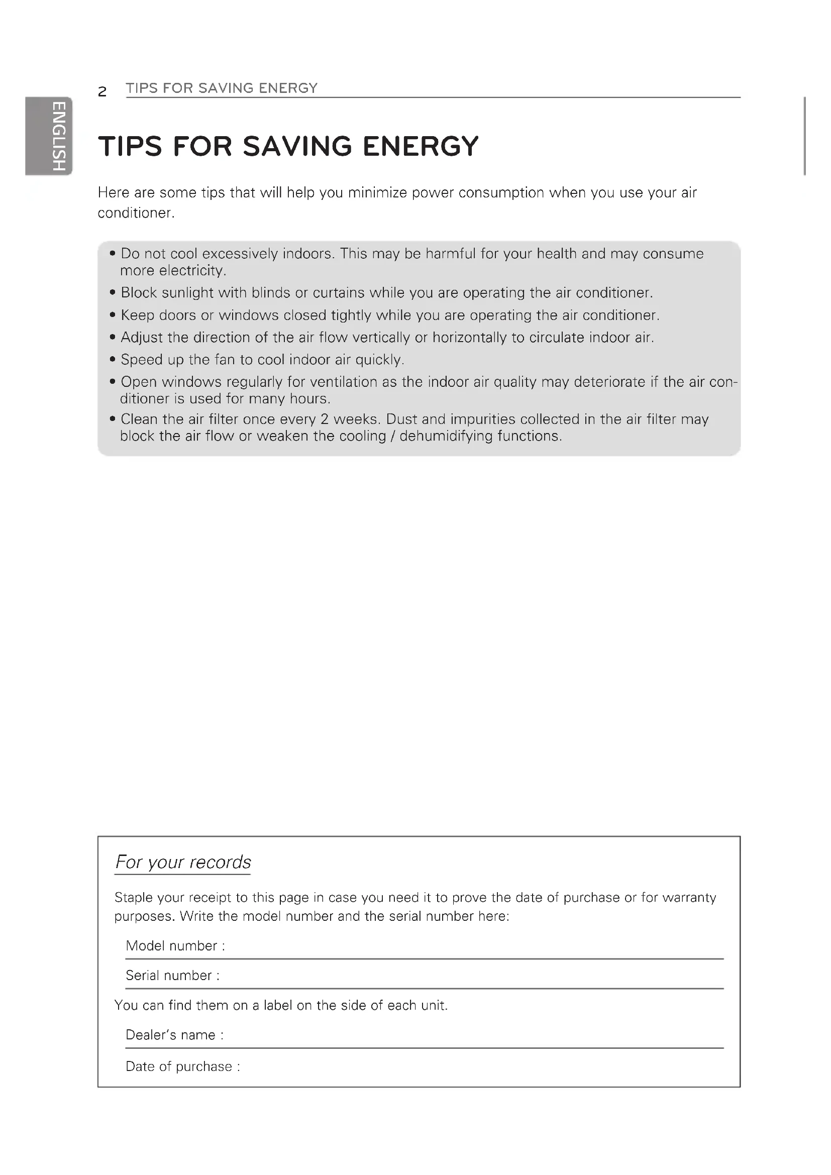 ENGLISH Here are some tips that will help you minimize power consumption when you use your airconditioner.• Do not cool excessively indoors. This may be harmful for your health and may consumemore electricity.• Block sunlight with blinds or curtains while you are operating the air conditioner.• Keep doors or windows closed tightly while you are operating the air conditioner.• Adjust the direction of the air flow vertically or horizontally to circulate indoor air.• Speed up the fan to cool indoor air quickly.• Open windows regularly for ventilation as the indoor air quality may deteriorate if the air con-ditioner is used for many hours.• Clean the air filter once every 2 weeks. Dust and impurities collected in the air filter mayblock the air flow or weaken the cooling / dehumidifying functions. For your records Staple your receipt to this page in case you need it to prove the date of purchase or for warranty purposes. Write the model number and the serial number here:Model number :Serial number :You can find them on a label on the side of each unit.Dealer’s name :Date of purchase :