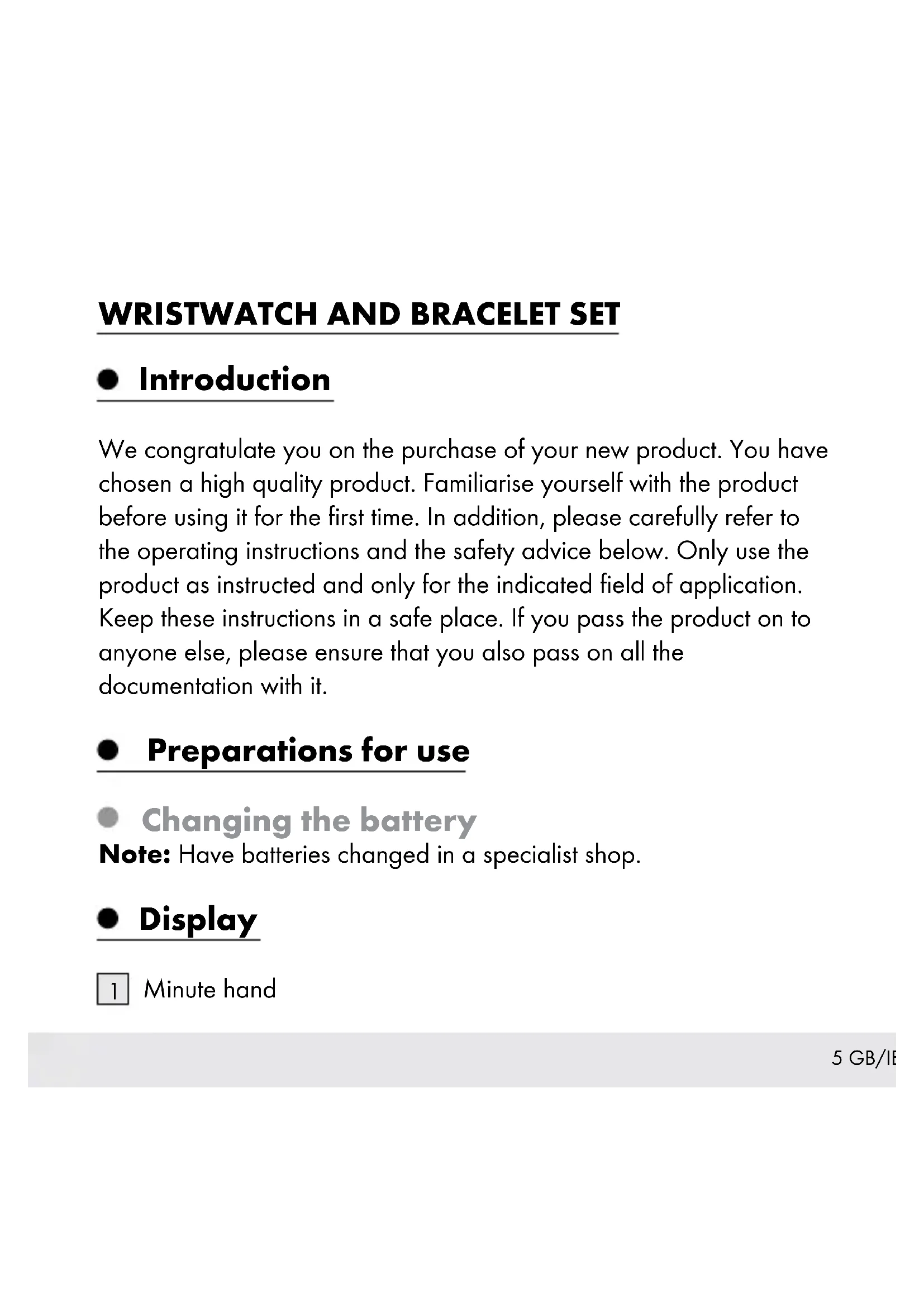 WRISTWATCH AND BRACELET SET Operation and Safety Notes