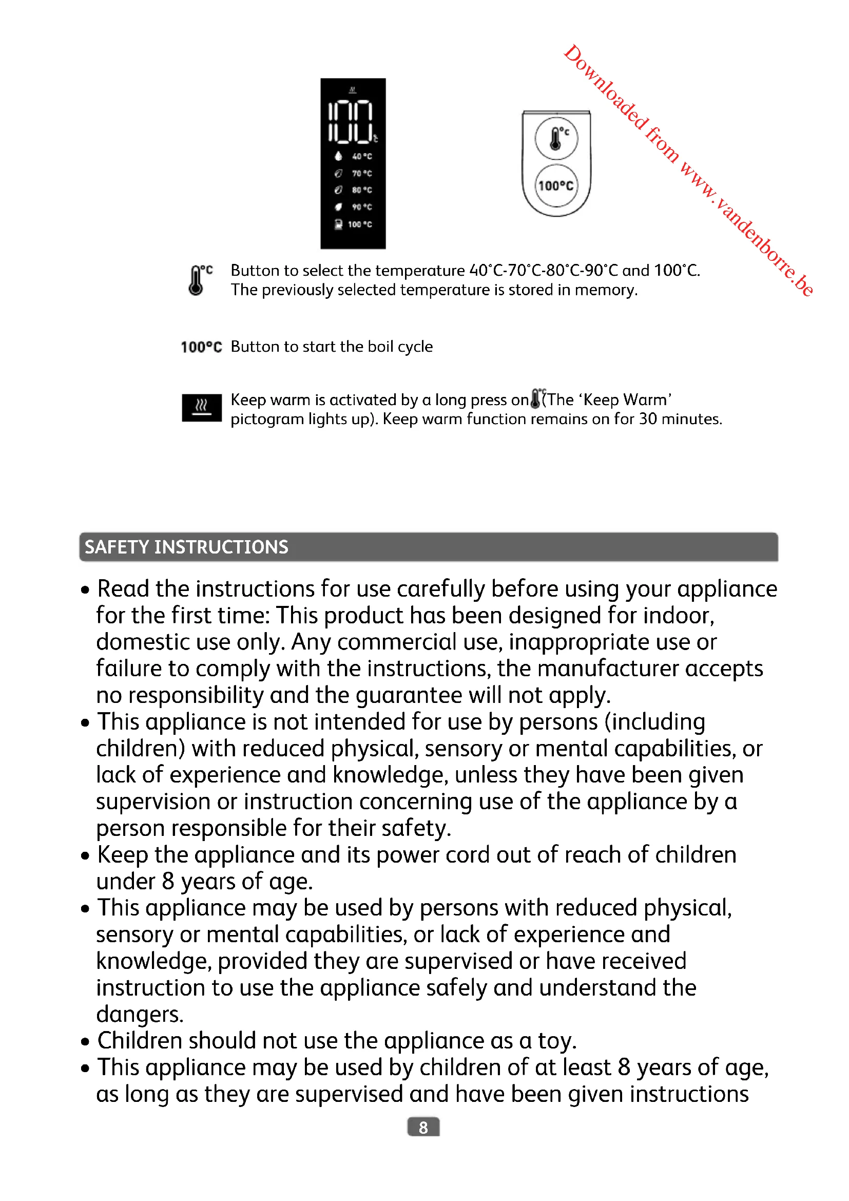 - This appliance may be used by children of at least 8 years of age, as long as they are supervised and have been given instructions SAFETY INSTRUCTIONS Button to select the temperature 40°C-70°C-80°C-90°C and 100°C. The previously selected temperature is stored in memory. Button to start the boil cycle Keep warm is activated by a long press on (The ‘Keep Warm’ pictogram lights up). Keep warm function remains on for 30 minutes. Downloaded from www.vandenborre.be9 about using the appliance safely and are fully aware of the dangers involved. Cleaning and maintenance should not be carried out by children unless they are at least 8 years of age and are supervised by an adult.
