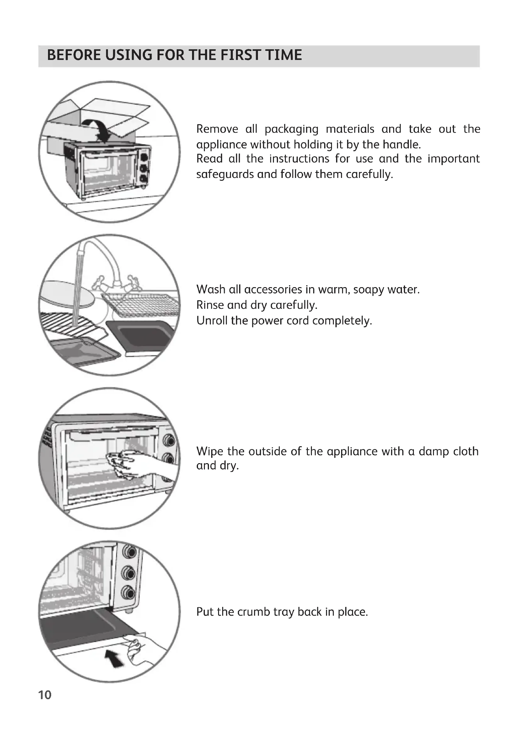 Remove all packaging materials and take out the appliance without holding it by the handle. Read all the instructions for use and the important safeguards and follow them carefully. Wash all accessories in warm, soapy water. Rinse and dry carefully. Unroll the power cord completely. Wipe the outside of the appliance with a damp cloth and dry. Put the crumb tray back in place. NoticeFOUR_QUARTZTECH_NC00025433_Mise en page 1 29/03/12 07:48 Page10450°F 230°C