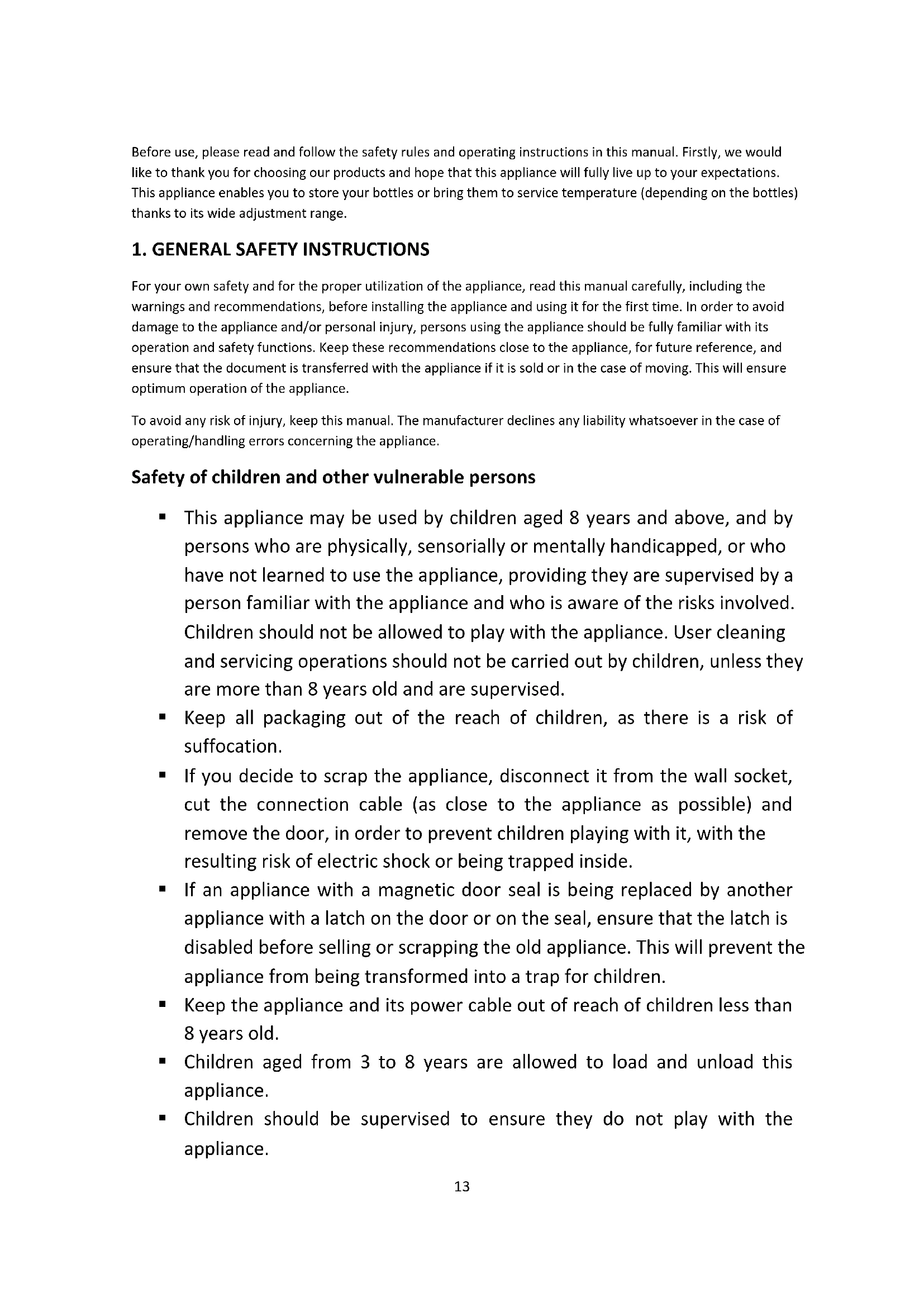 For your own safety and for the proper utilization of the appliance, read this manual carefully, including the warnings and recommendations, before installing the appliance and using it for the first time. In order to avoid damage to the appliance and/or personal injury, persons using the appliance should be fully familiar with its operation and safety functions. Keep these recommendations close to the appliance, for future reference, and ensure that the document is transferred with the appliance if it is sold or in the case of moving. This will ensure optimum operation of the appliance. To avoid any risk of injury, keep this manual. The manufacturer declines any liability whatsoever in the case of operating/handling errors concerning the appliance. Safety of children and other vulnerable persons