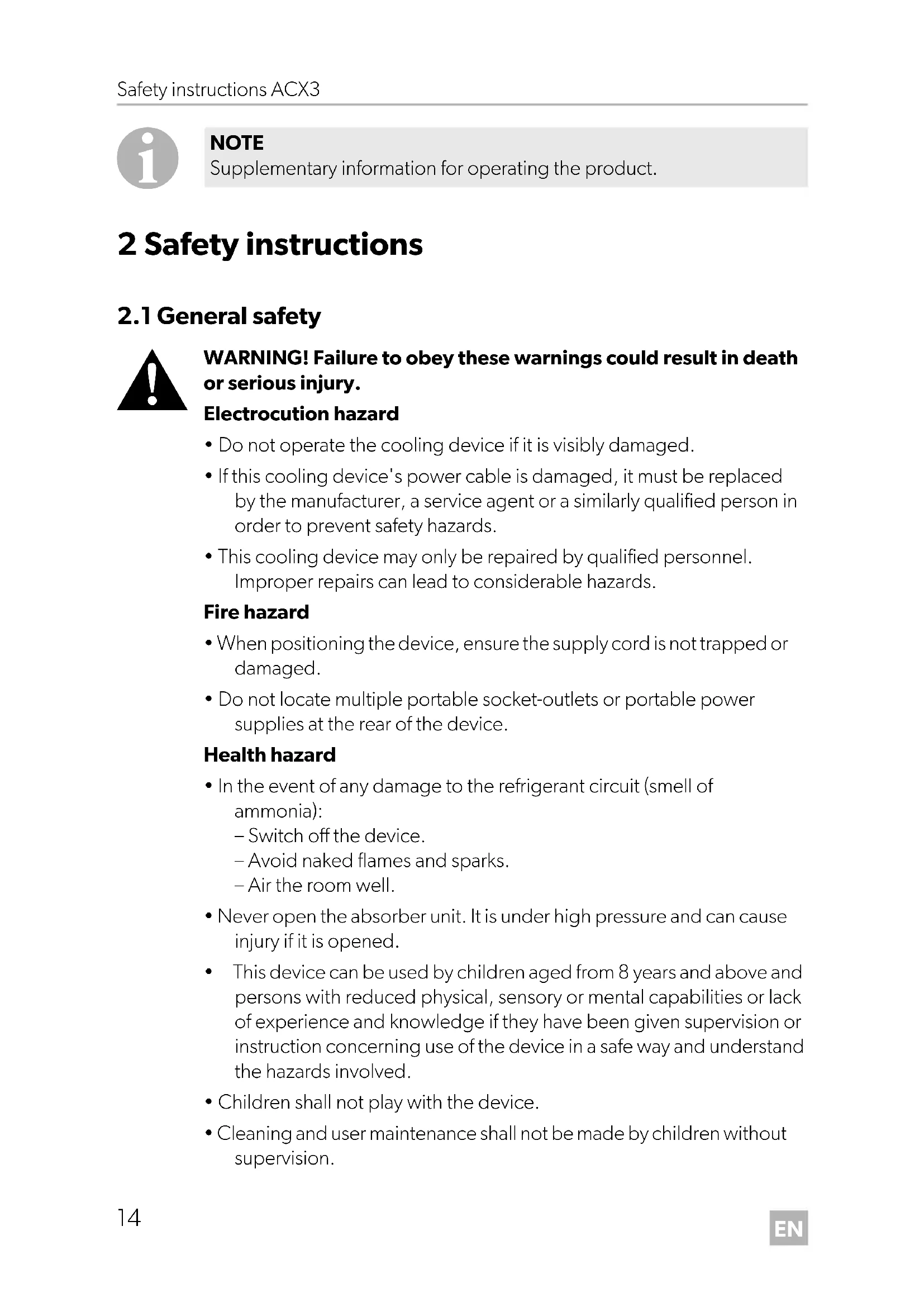 WARNING! Safety instruction: Indicates a hazardous situation that, if not avoided, could result in death or serious injury. CAUTION! Safety instruction: Indicates a hazardous situation that, if not avoided, could result in minor or moderate injury. NOTICE! Indicates a situation that, if not avoided, can result in property damage. DometicACX3_30-ACX3_40-ACX3_40G_OPM_4445103211_EMEA16_202x-xx-xx.book Seite 13 Donnerstag, 15. Juli 2021 5:12 17EN Safety instructions ACX3