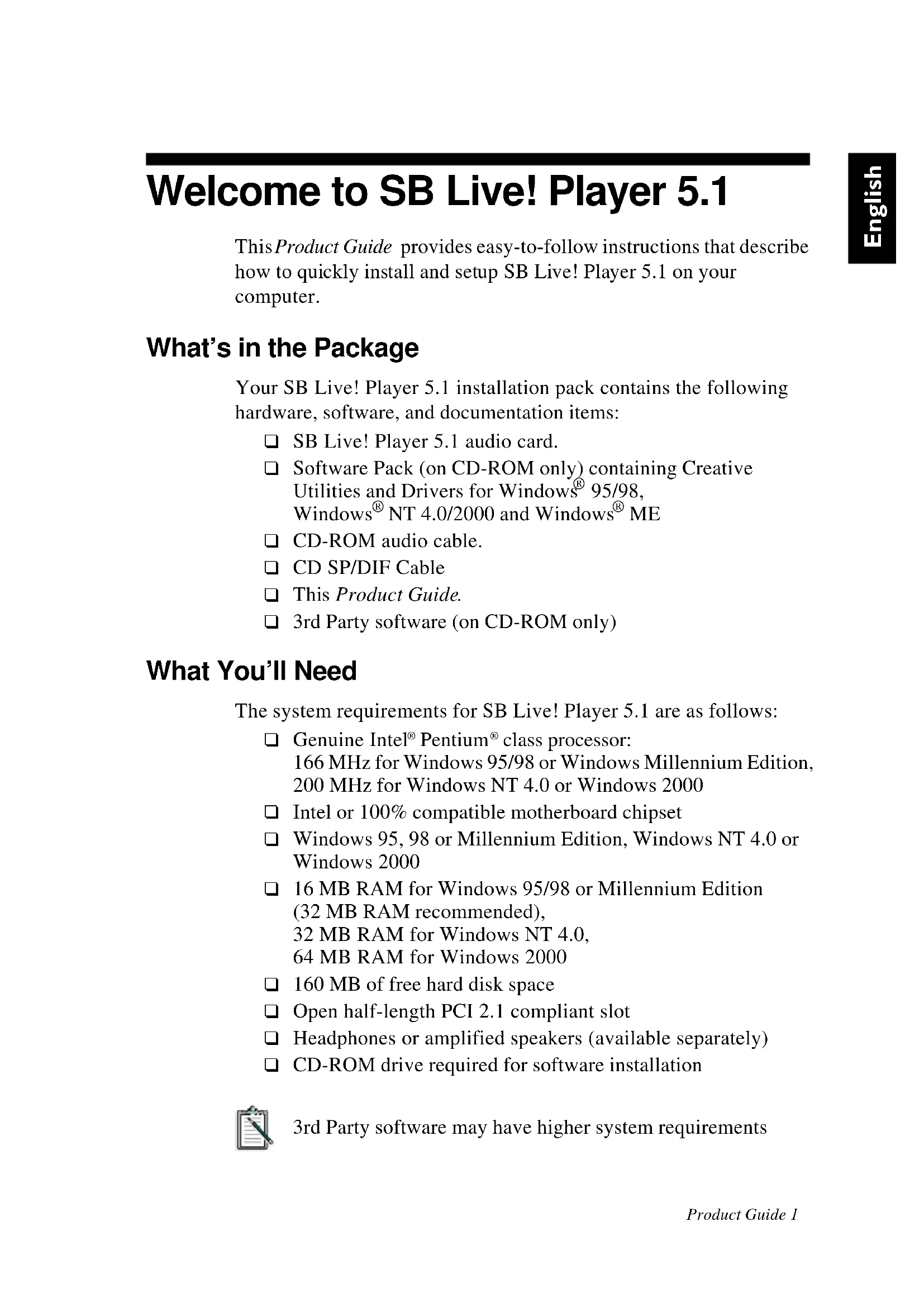 3rd Party software (on CD-ROM only) What You’ll Need The system requirements for SB Live! Player 5.1 are as follows: