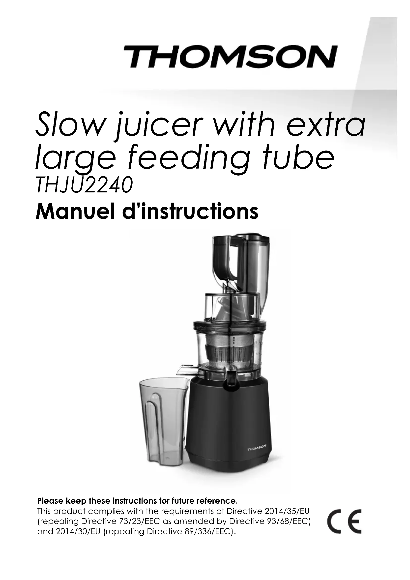 Ce produit est importé par : SCHNEIDER CONSUMER GROUP 12, rue Jules Ferry, 93110 Rosny-sous-Bois, FRANCE FR-19Slow juicer with extra large feeding tube THJU2240 Manuel d'instructions Please keep these instructions for future reference. This product complies with the requirements of Directive 2014/35/EU (repealing Directive 73/23/EEC as amended by Directive 93/68/EEC) and 2014/30/EU (repealing Directive 89/336/EEC).EN-2 Important Safety Instruction For safety, to avoid loss or hurt to you or others, please be sure to observe the following safety precautions;If you do not follow the safety precautions and wrong usage may lead to accidents. Please follow these instructions for using the device: - The appliance must not be used by children or by people with disabilities. - Children should not play with this device.