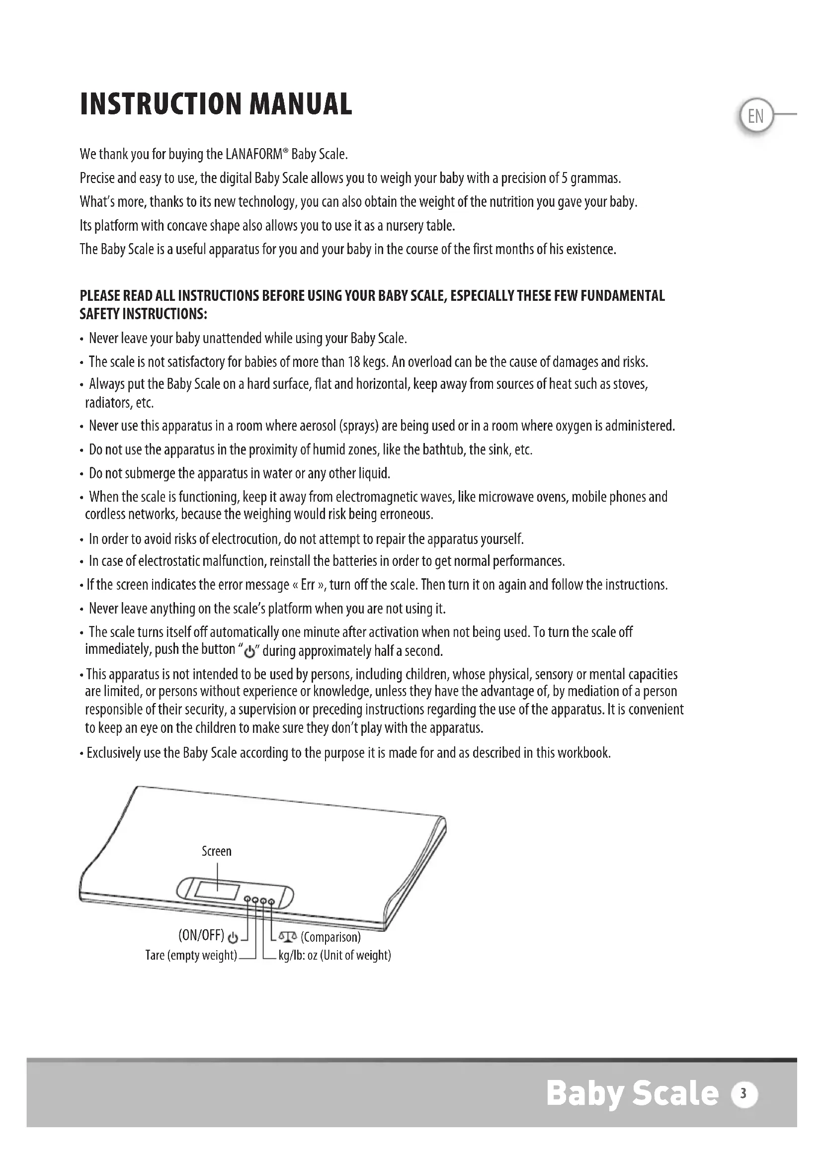 InstructIon manual We thank you for buying the LANAFORM® Baby Scale. Precise and easy to use, the digital Baby Scale allows you to weigh your baby with a precision of 5 grammas. What’s more, thanks to its new technology, you can also obtain the weight of the nutrition you gave your baby. Its platform with concave shape also allows you to use it as a nursery table. The Baby Scale is a useful apparatus for you and your baby in the course of the first months of his existence. PLEASE READ ALL INSTRUCTIONS BEFORE USING YOUR BABY SCALE, ESPECIALLY THESE FEW FUNDAMENTAL SAFETY INSTRUCTIONS: