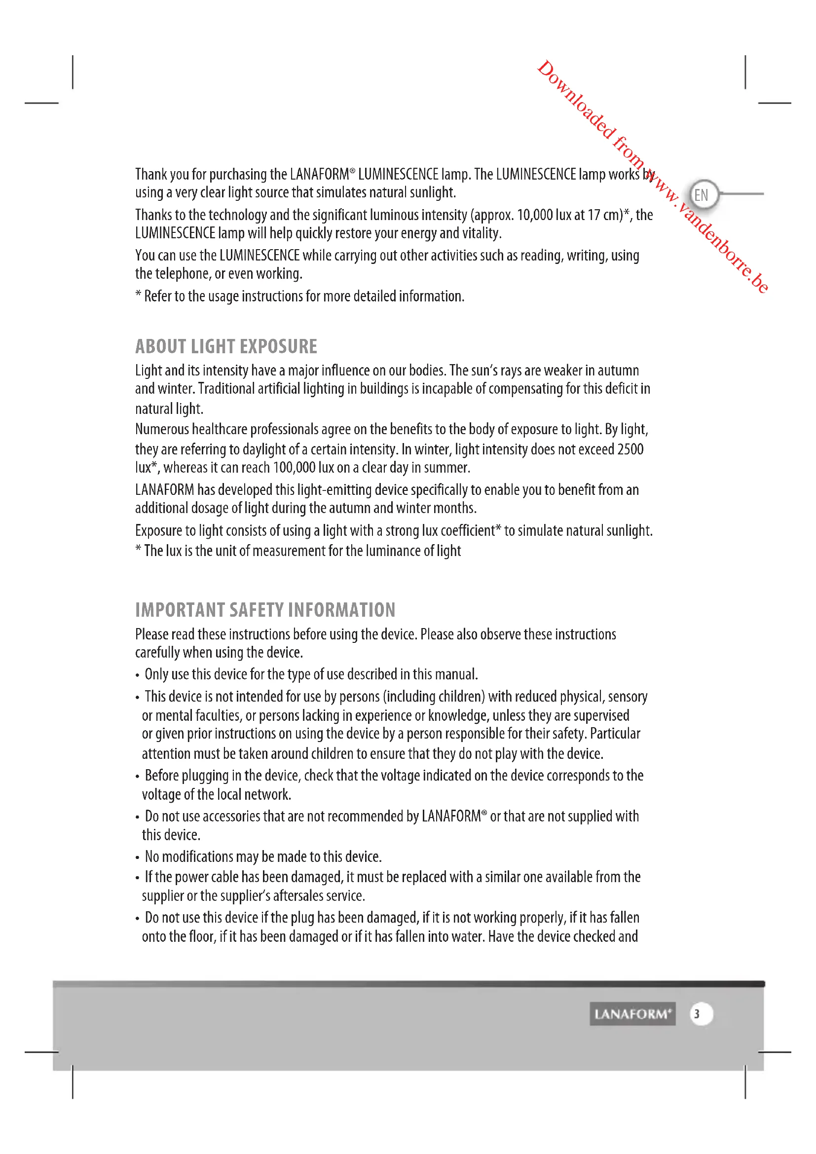 fig. 4 fig. 5 fig. 7fig. 6 fig. 2 fig. 3 Downloaded from www.vandenborre.beThank you for purchasing the LANAFORM® LUMINESCENCE lamp. The LUMINESCENCE lamp works by using a very clear light source that simulates natural sunlight. Thanks to the technology and the significant luminous intensity (approx. 10,000 lux at 17 cm)*, the LUMINESCENCE lamp will help quickly restore your energy and vitality. You can use the LUMINESCENCE while carrying out other activities such as reading, writing, using the telephone, or even working.