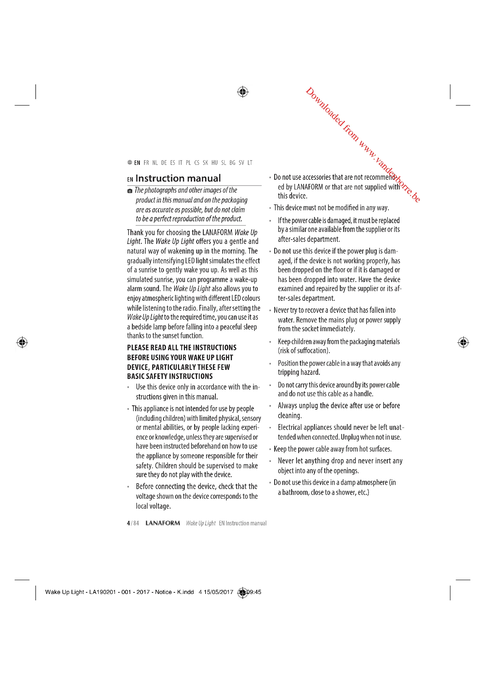 Wake Up Light - LA190201 - 001 - 2017 - Notice - K.indd 3 15/05/2017 15:09:45 Downloaded from www.vandenborre.be4 / 84 Wake Up Light EN Instruction manual EN FR NL DE ES IT PL CS SK HU SL BG SV LT EN Instruction manual The photographs and other images of the product in this manual and on the packaging are as accurate as possible, but do not claim to be a perfect reproduction of the product. Thank you for choosing the LANAFORM Wake Up Light. The Wake Up Light oers you a gentle and natural way of wakening up in the morning. The gradually intensifying LED light simulates the eect of a sunrise to gently wake you up. As well as this simulated sunrise, you can programme a wake-up alarm sound. The Wake Up Light also allows you to enjoy atmospheric lighting with dierent LED colours while listening to the radio. Finally, after setting the Wake Up Light to the required time, you can use it as a bedside lamp before falling into a peaceful sleep thanks to the sunset function.