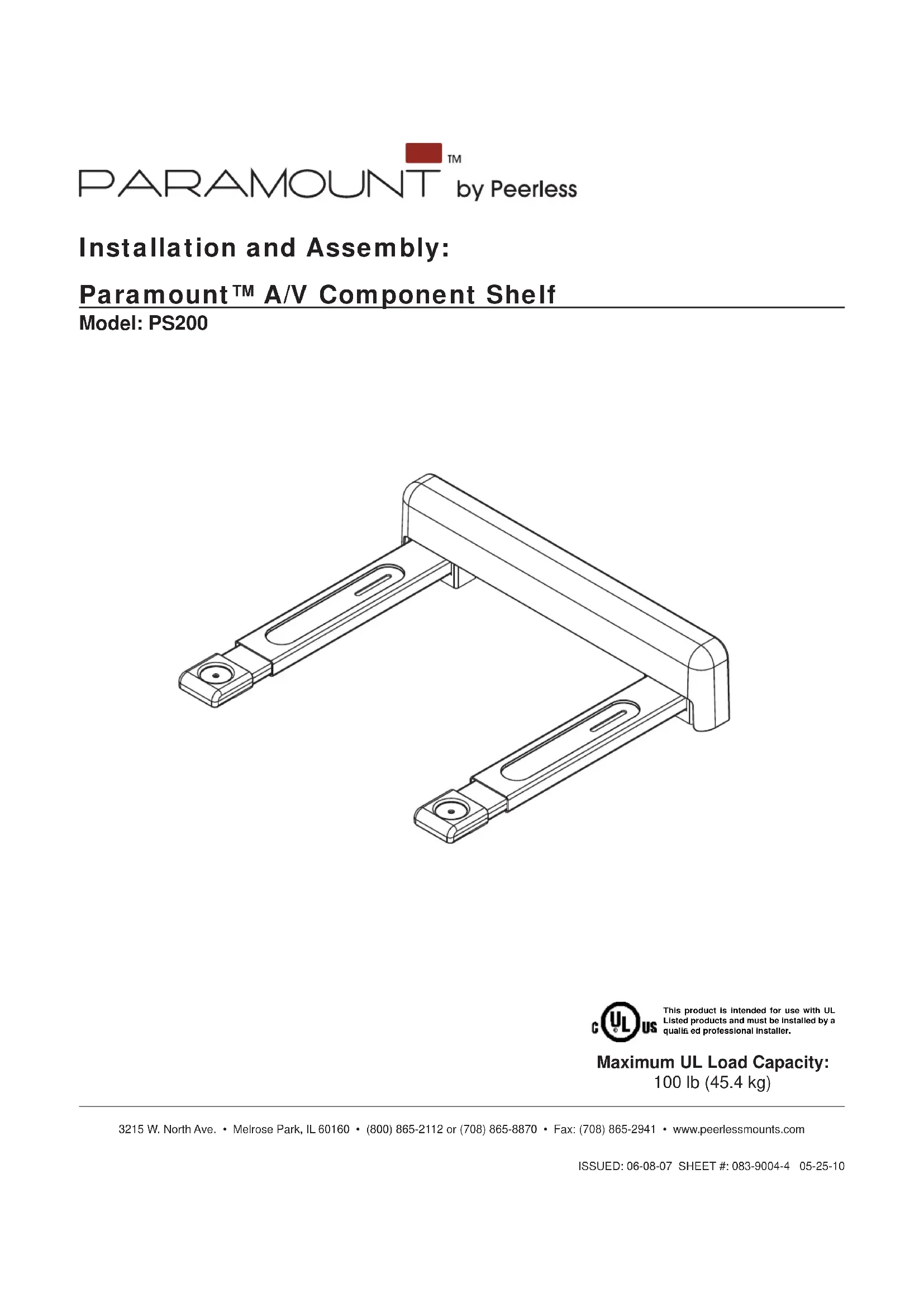 3215 W. North Ave. • Melrose Park, IL 60160 • (800) 865-2112 or (708) 865-8870 • Fax: (708) 865-2941 • www.peerlessmounts.com ISSUED: 06-08-07 SHEET #: 083-9004-4 05-25-10 Installation and Assembly: Paramount™ A/V Component Shelf Model: PS200 Maximum UL Load Capacity: 100 lb (45.4 kg) This product is intended for use with UL Listed products and must be installed by a qualifi ed professional installer.2 of 21 ISSUED: 06-08-07 SHEET #: 083-9004-4 05-25-10 Note: Read entire instruction sheet before you start installation and assembly. Tools Needed for Assembly