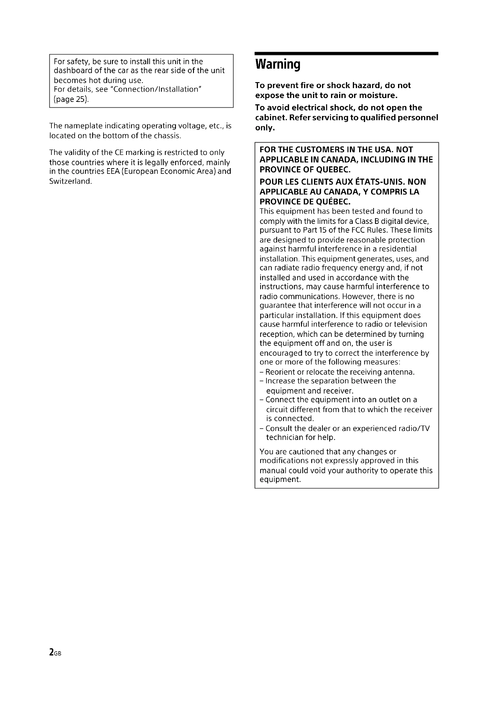 Manual de instrucciones ES2GB The nameplate indicating operating voltage, etc., is located on the bottom of the chassis. The validity of the CE marking is restricted to only those countries where it is legally enforced, mainly in the countries EEA (European Economic Area) and Switzerland. Warning To prevent fire or shock hazard, do not expose the unit to rain or moisture. To avoid electrical shock, do not open the cabinet. Refer servicing to qualified personnel only. For safety, be sure to install this unit in the dashboard of the car as the rear side of the unit becomes hot during use. For details, see “Connection/Installation” (page 25). FOR THE CUSTOMERS IN THE USA. NOT