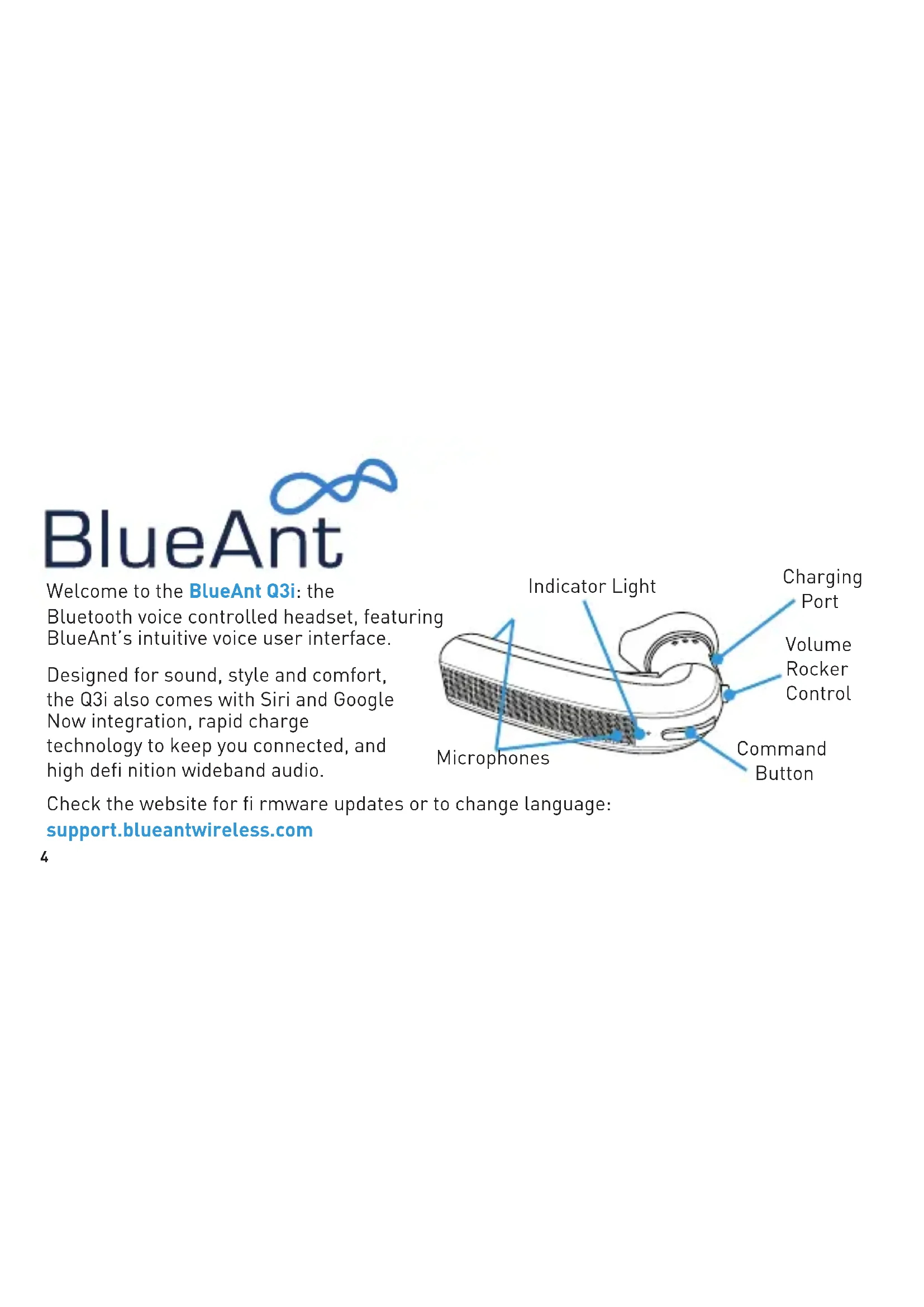 Q3iENGLISH ........................................................ 4 FRANÇAIS ...................................................... 30 ESPAÑOL ....................................................... 594 Welcome to the BlueAnt Q3i: the Bluetooth voice controlled headset, featuring BlueAnt’s intuitive voice user interface. Designed for sound, style and comfort, the Q3i also comes with Siri and Google Now integration, rapid charge technology to keep you connected, and high defi nition wideband audio. Check the website for fi rmware updates or to change language: support.blueantwireless.com Volume Rocker Control Command Button Microphones Indicator Light Charging Port5 Charge Your Headset Your headset has been given an initial partial charge to get you started, but for best results we recommend you fully charge it using the supplied USB cable. > Charge the Q3i whenever it announces that the battery is Very Low. It will switch off automatically if the battery runs out. > Your headset features Rapid Charge technology. It will charge to 50% capacity in just 30 minutes (a full charge takes about 2 hours). > During charging, the indicator light fl ashes red. > When the light goes white, the charge is complete. > The Q3i features an iPhone battery meter so you can check your battery status at a glance. Hardware Power Switch6 Wearing the Q3i You can wear the Q3i in either ear. For best results: > Rotate the ear gel as shown here. > Make sure that the headset is angled towards your mouth. Pair Your Headset To use the Q3i you need to pair it with your phone.