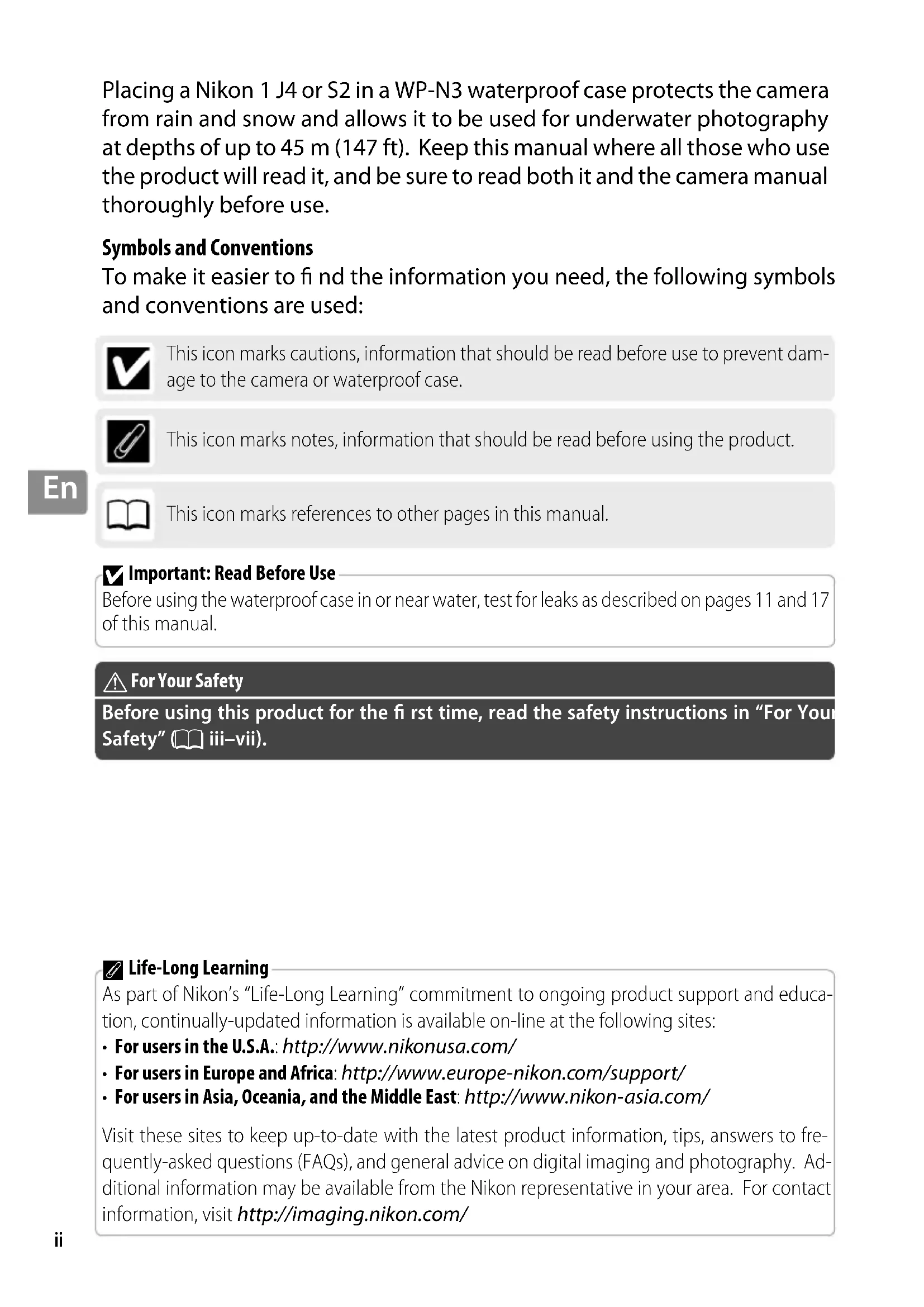 Placing a Nikon1 J4 or S2 in a WP-N3 waterproof case protects the camera from rain and snow and allows it to be used for underwater photography at depths of up to 45m (147ft). Keep this manual where all those who use the product will read it, and be sure to read both it and the camera manual thoroughly before use. Symbols and Conventions To make it easier to nd the information you need, the following symbols and conventions are used: This icon marks cautions, information that should be read before use to prevent dam- age to the camera or waterproof case. This icon marks notes, information that should be read before using the product. This icon marks references to other pages in this manual.