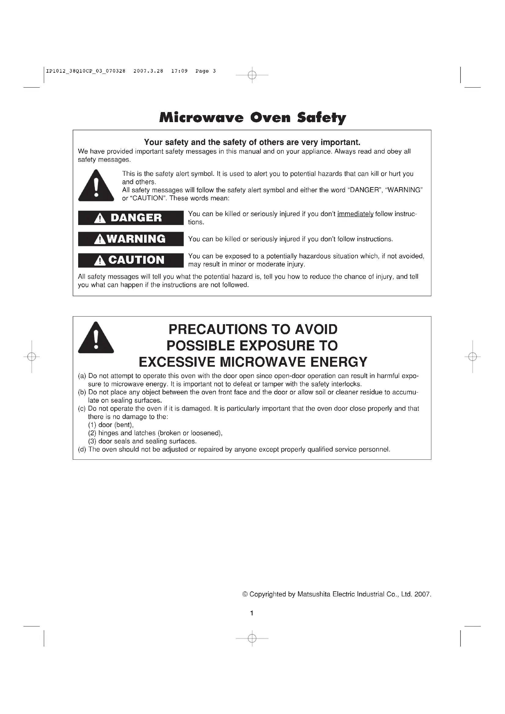 Your microwave oven is a cooking appliance and you should use as much care as you use with a stove or any other cooking appliance. When using this electrical appliances, basic safety precautions should be followed, including the following: Thank you for purchasing a Panasonic Microwave Oven. WARNING IP1012_38Q10CP_03_070328 2007.3.28 17:09 Page 43