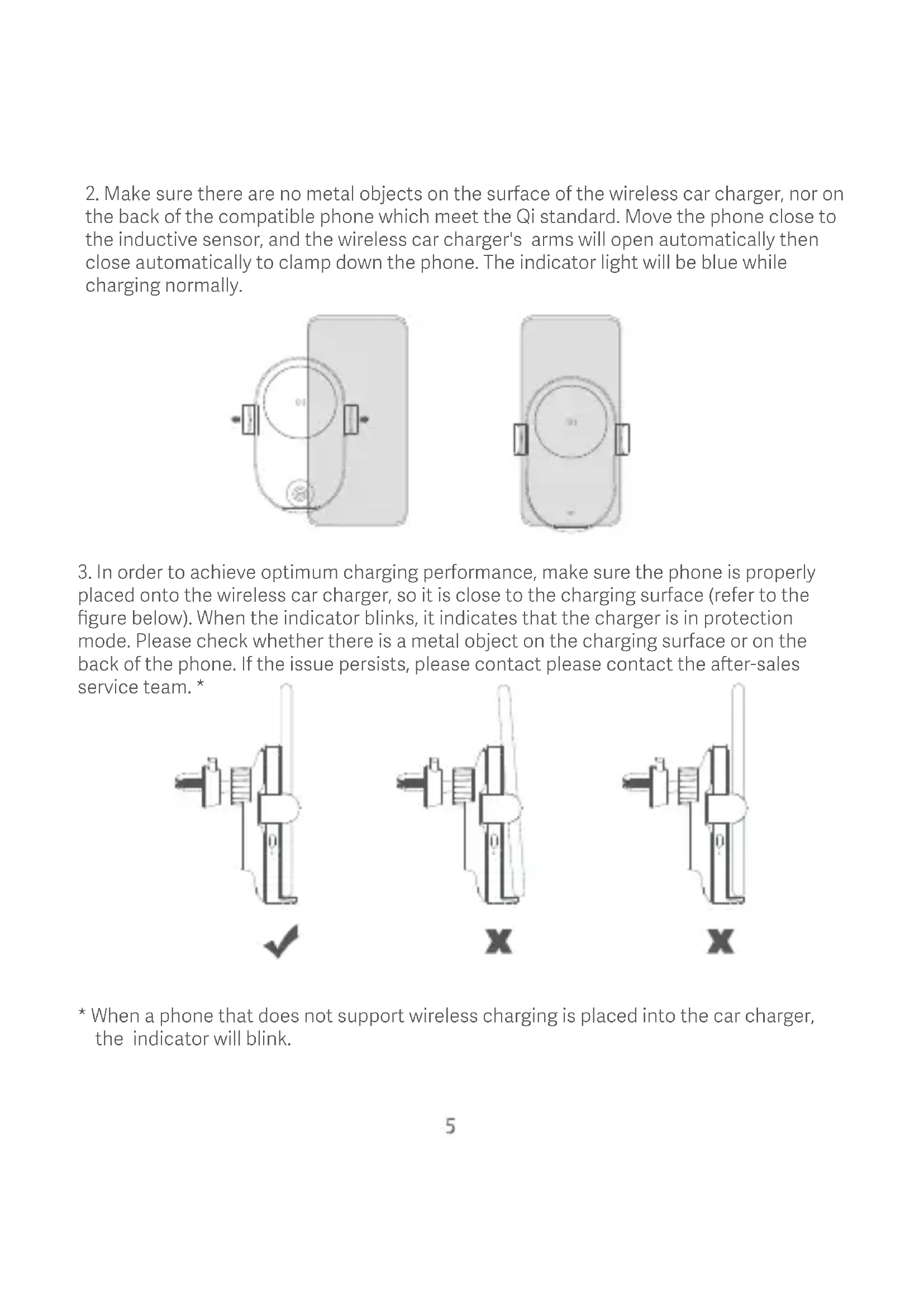 the universal ball knob on the back. Plug in the supplied charger into the car's cigarette lighter or power port, and insert the USB-A interface into the charger's red USB port. Then plug in the Type-C interface into the car charger. When the indicator blinks blue three times, and the welcome light remains lit up, the wireless car charger is functioning normally.2. Make sure there are no metal objects on the surface of the wireless car charger, nor on the back of the compatible phone which meet the Qi standard. Move the phone close to the inductive sensor, and the wireless car charger's arms will open automatically then close automatically to clamp down the phone. The indicator light will be blue while charging normally.