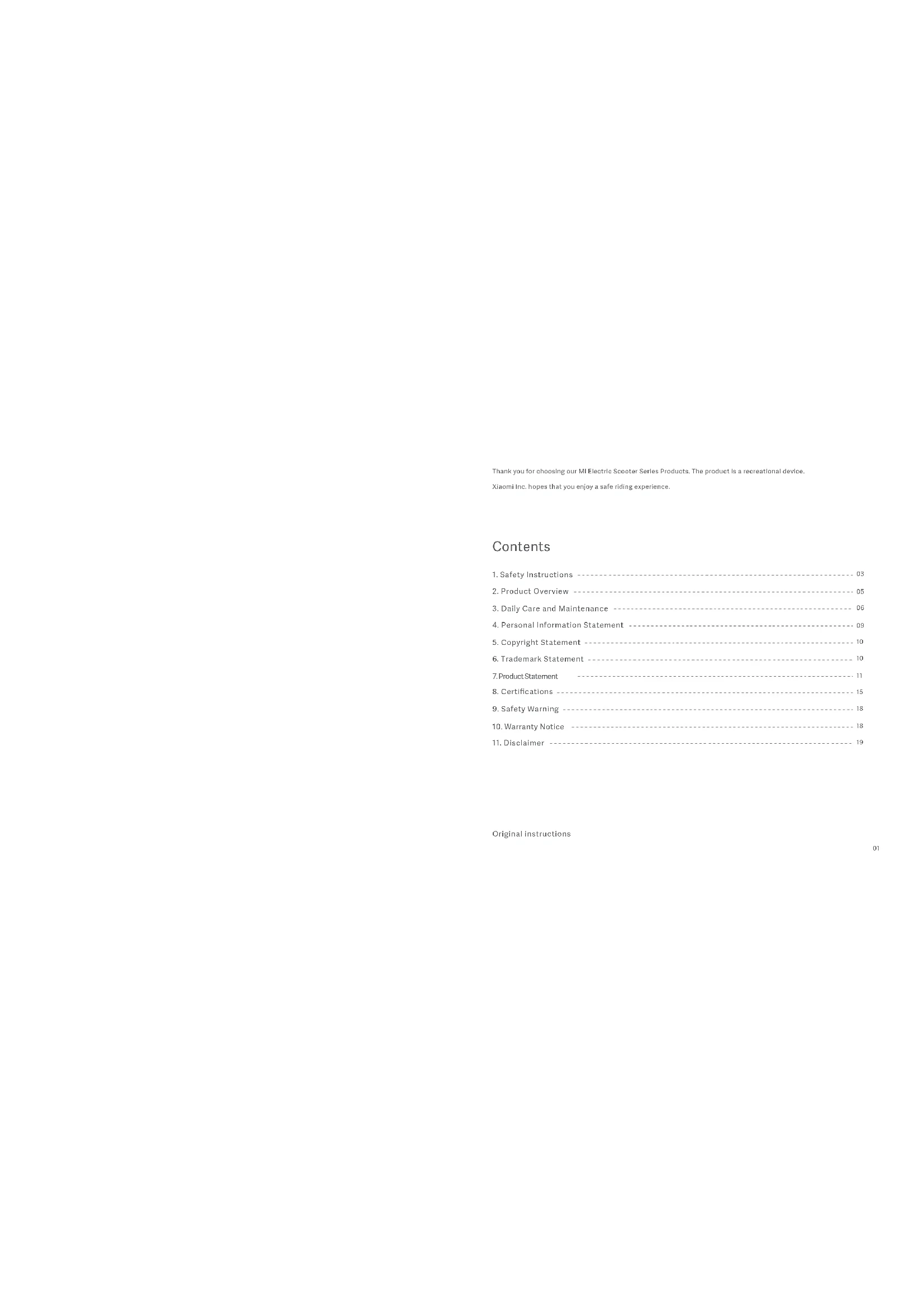 Original instructions Thank you for choosing our Mi Electric Scooter Series Products. The product is a recreational device. Xiaomi Inc. hopes that you enjoy a safe riding experience.02 03 IMPORTANT! Read carefully and keep for future reference. For more information about the instructions of Mi Electric Scooter series products, please visit www.mi.com/global/service/userguide.