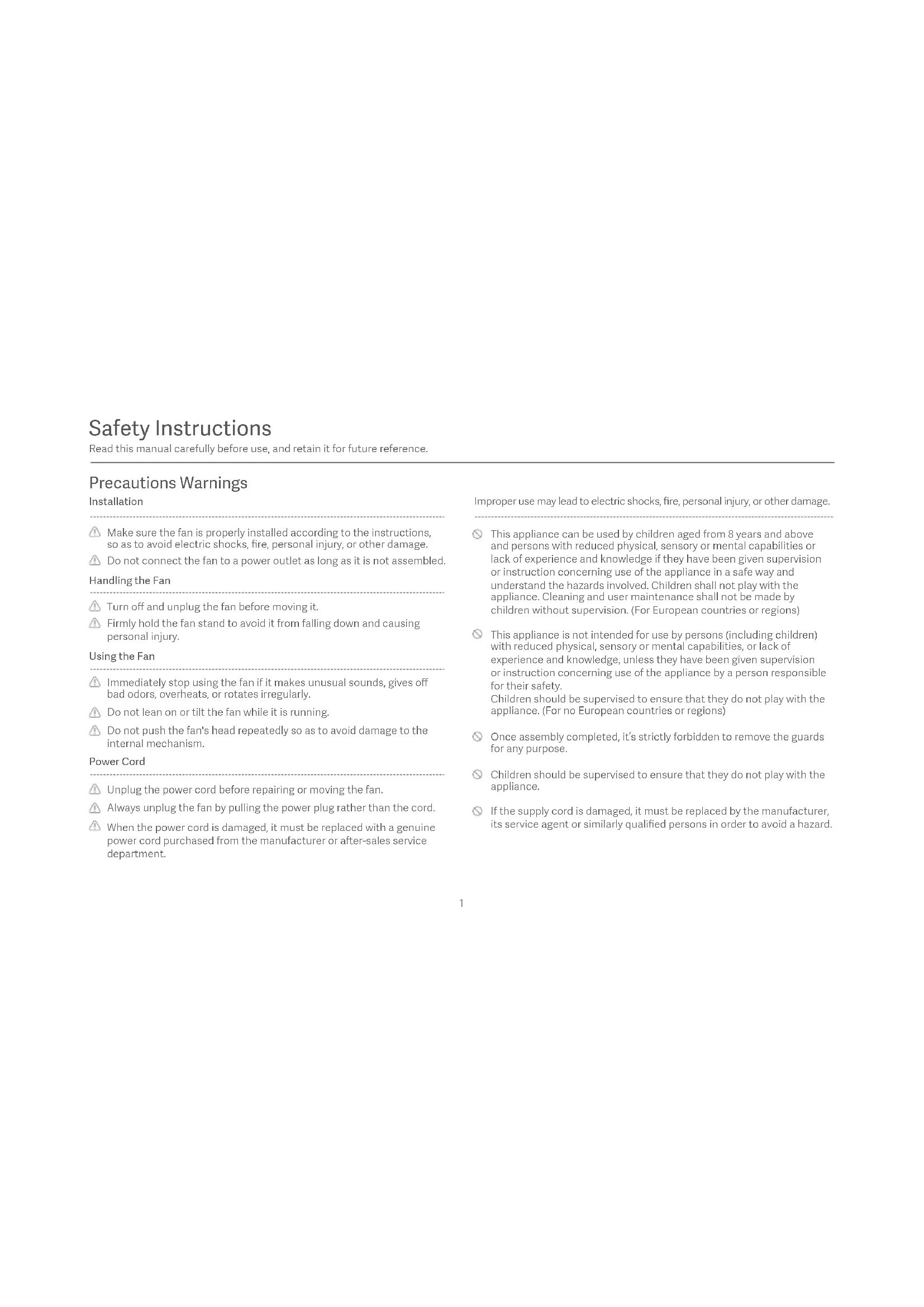 This appliance can be used by children aged from 8 years and above and persons with reduced physical, sensory or mental capabilities or lack of experience and knowledge if they have been given supervision or instruction concerning use of the appliance in a safe way and understand the hazards involved. Children shall not play with the appliance. Cleaning and user maintenance shall not be made by children without supervision. (For European countries or regions) This appliance is not intended for use by persons (including children) with reduced physical, sensory or mental capabilities, or lack of experience and knowledge, unless they have been given supervision or instruction concerning use of the appliance by a person responsible for their safety. Children should be supervised to ensure that they do not play with the appliance. (For no European countries or regions) Once assembly completed, it’s strictly forbidden to remove the guards for any purpose. Children should be supervised to ensure that they do not play with the appliance. If the supply cord is damaged, it must be replaced by the manufacturer, its service agent or similarly qualified persons in order to avoid a hazard.Read this manual carefully before use, and retain it for future reference. Safety Instructions Do not use this fan in place where it is easy to fall over or where there are other unstable objects nearby. Under normal use of condition, this equipment should be kept a separation distance of at least 20cm between the antenna and the body of the user. Do not use this fan in hot and humid environments such as a bathroom. Do not allow adults who are incapable of operating this fan or children to use it. Do not disassemble or repair this fan. Keep hair and fabrics away from the fan to avoid geing them caught in the fan. Do not use any improper power outlet. Do not pinch, bend, or twist the power cord too much, so as to prevent from exposing or breaking its core. Do not use this fan if its front grille is not installed, or its rear grille is loose or fell off. Do not use this fan if its power cord is damaged or its power plug is loose. Do not insert your fingers or any object into the front grille, rear grille, or the fan blades when the fan is in use. Warnings Improper use may lead to electric shocks, fire, personal injury, or other damage. Do not use the supplied power cord with any other device.