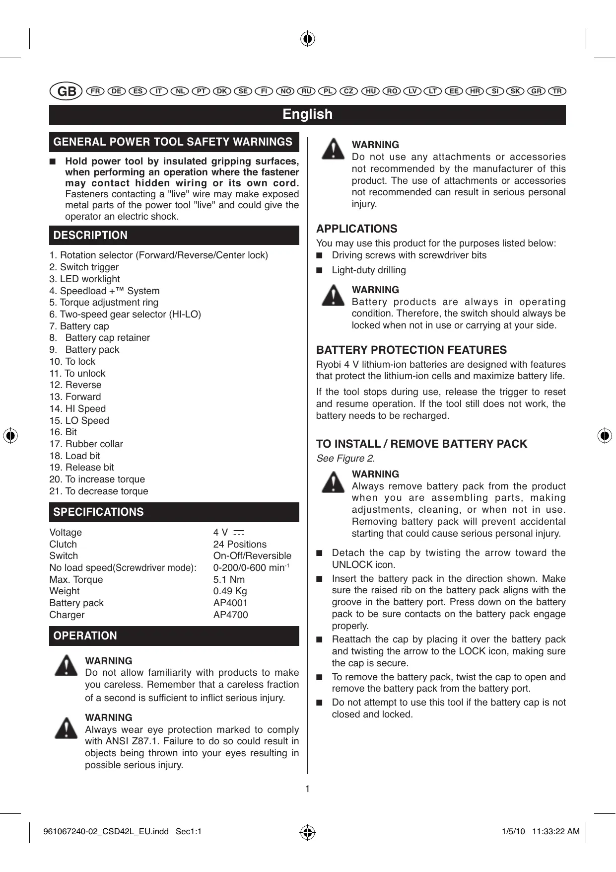 USER MANUAL CSD 40 LI, CSD42L RYOBI
