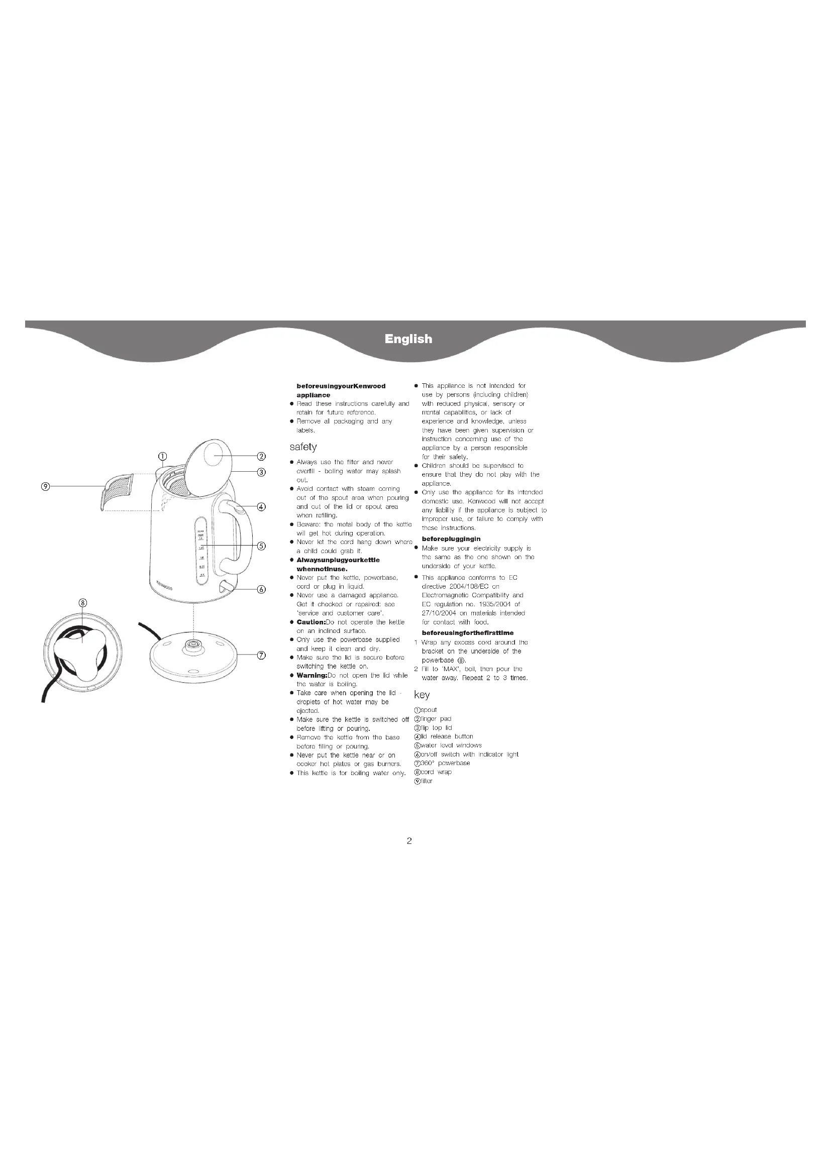This appliance conforms to EC directive 2004/108/EC on Electromagnetic Compatibility and EC regulation no. 1935/2004 of 27/10/2004 on materials intended for contact with food. before using for the first time 1 Wrap any excess cord around the bracket on the underside of the powerbase 햹. 2 Fill to ‘MAX’, boil, then pour the water away. Repeat 2 to 3 times. key 햲 spout 햳 finger pad 햴 flip top lid 햵 lid release button 햶 water level windows 햷 on/off switch with indicator light 햸 360° powerbase 햹 cord wrap 햺 filter English