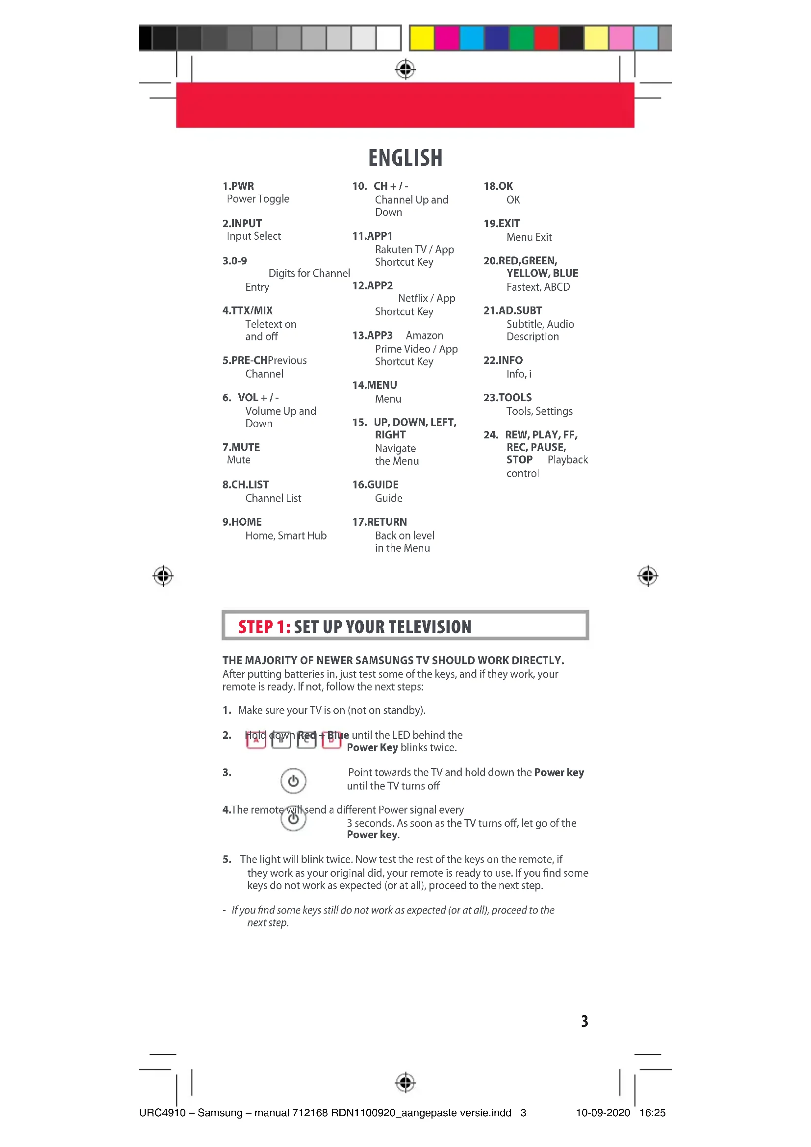 STEP 2: IF STEP 1 DOES NOT WORK AS EXPECTED URC4910 – Samsung – manual 712168 RDN1100920_aangepaste versie.indd 4URC4910 – Samsung – manual 712168 RDN1100920_aangepaste versie.indd 4 10-09-2020 16:2510-09-2020 16:255 ENGLISH SOUND BAR / AUDIO RECEIVER VOLUME CONTROL If you have your TV connected to a Sound Bar or Audio Receiver, it’s possible to set up your One For All remote to control the Volume and Mute of this device. There are two ways to do this:AUDIO SIMPLESETIf you have a Sound Bar or Audio Device from one of the brands listed in the table below, you can use the SimpleSet method to program your remote to control it. If you do not have one of the below brands, please proceed to the next section.Note that each of the brands has a digit associated with it, for example 4 for LG (and JVC).To set up your remote to control your Sound Bar / Audio Device, rst make sure your TV and Sound Bar / Audio Device are both powered on, and that there is something playing that you can hear (this procedure will test the Mute function). Next: