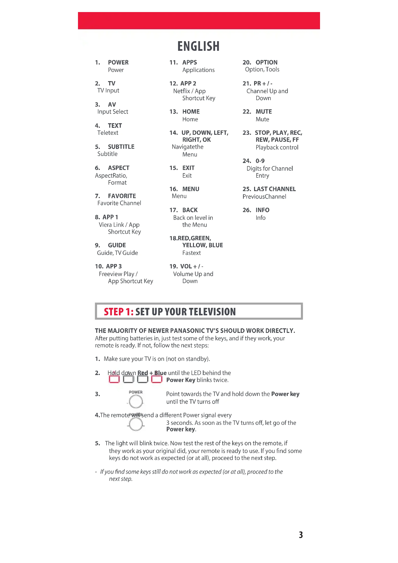 STEP 2: IF STEP 1 DOES NOT WORK AS EXPECTED 712188_Panasonic_manual URC4914_RDN1091120.indd 4712188_Panasonic_manual URC4914_RDN1091120.indd 4 09-11-2020 13:1509-11-2020 13:155 ENGLISH SOUND BAR / AUDIO RECEIVER VOLUME CONTROL If you have your TV connected to a Sound Bar or Audio Receiver, it’s possible to set up your One For All remote to control the Volume and Mute of this device. There are two ways to do this:AUDIO SIMPLESETIf you have a Sound Bar or Audio Device from one of the brands listed in the table below, you can use the SimpleSet method to program your remote to control it. If you do not have one of the below brands, please proceed to the next section.Note that each of the brands has a digit associated with it, for example 4 for LG (and JVC).To set up your remote to control your Sound Bar / Audio Device, rst make sure your TV and Sound Bar / Audio Device are both powered on, and that there is something playing that you can hear (this procedure will test the Mute function). Next:
