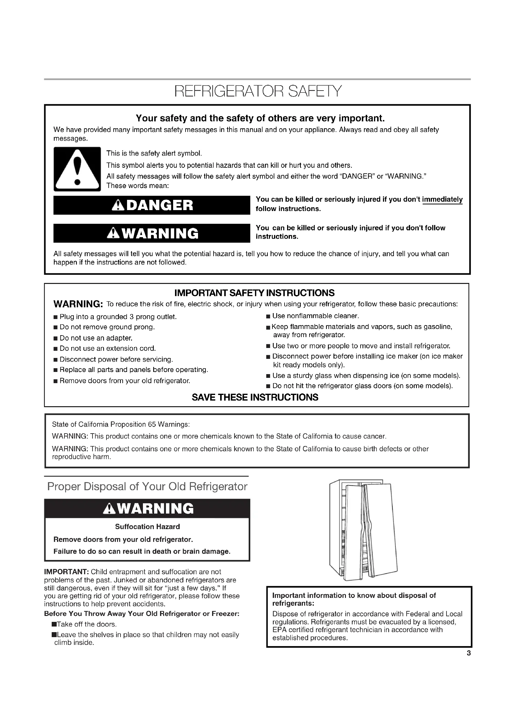 ACCESSOIRES ......................................................................... 60 FEUILLES DE DONNÉES SUR LA PERFORMANCE ............. 61 GARANTIE ................................................................................ 623 You can be killed or seriously injured if you don't immediately You can be killed or seriously injured if you don'tfollow All safety messages will tell you what the potential hazard is, tell you how to reduce the chance of injury, and tell you what can happen if the instructions are not followed. Your safety and the safety of others are very important. We have provided many important safety messages in this manual and on your appliance. Always read and obey all safety messages.This is the safety alert symbol.This symbol alerts you to potential hazards that can kill or hurt you and others.All safety messages will follow the safety alert symbol and either the word “DANGER” or “WARNING.”These words mean:follow instructions.instructions. DANGER WARNING REFRIGERATOR SAFETY State of California Proposition 65 Warnings:WARNING: This product contains one or more chemicals known to the State of California to cause cancer.WARNING: This product contains one or more chemicals known to the State of California to cause birth defects or other reproductive harm.