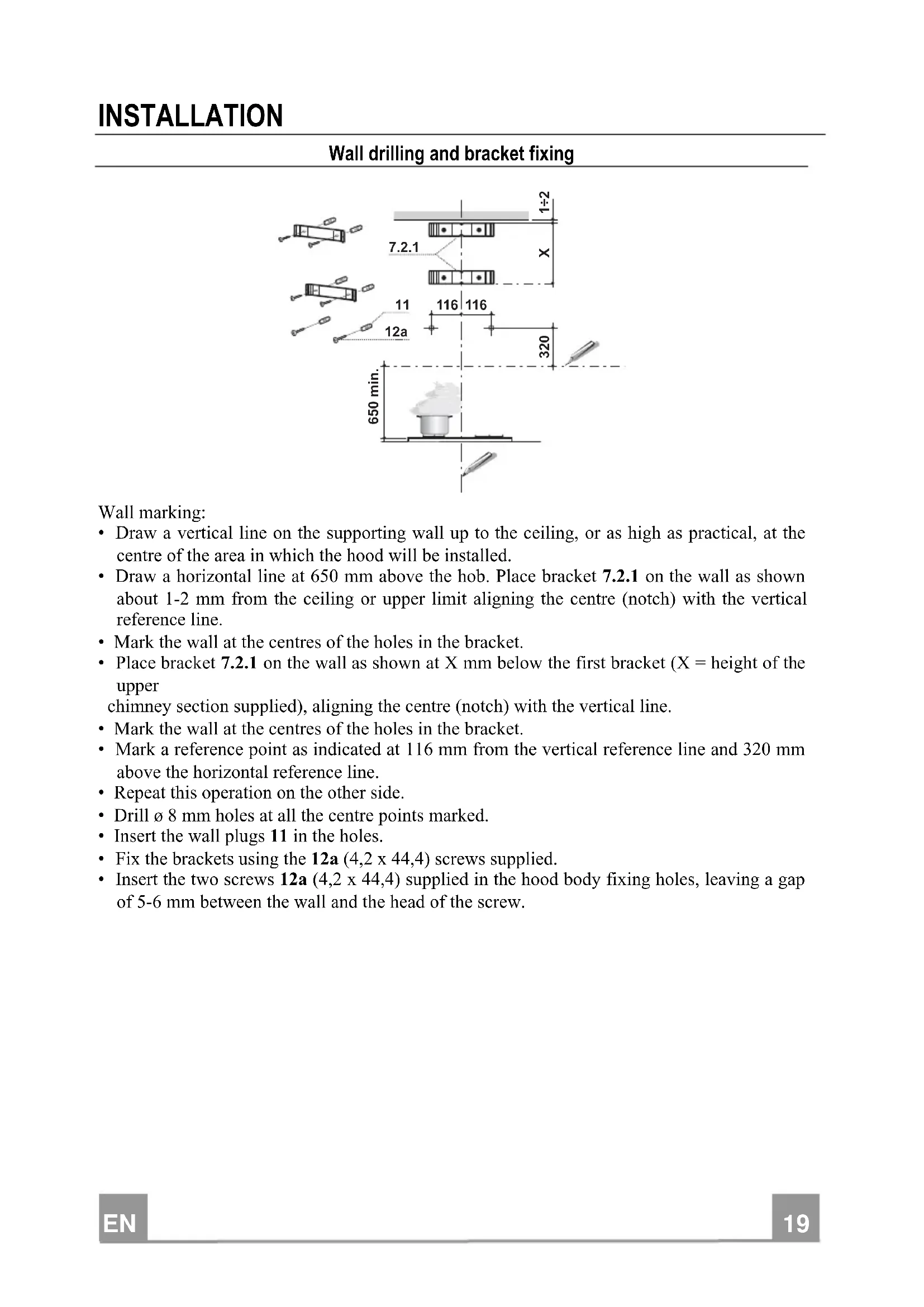 - Insert the two screws 12a (4,2 x 44,4) supplied in the hood body fixing holes, leaving a gap of 5-6 mm between the wall and the head of the screw.