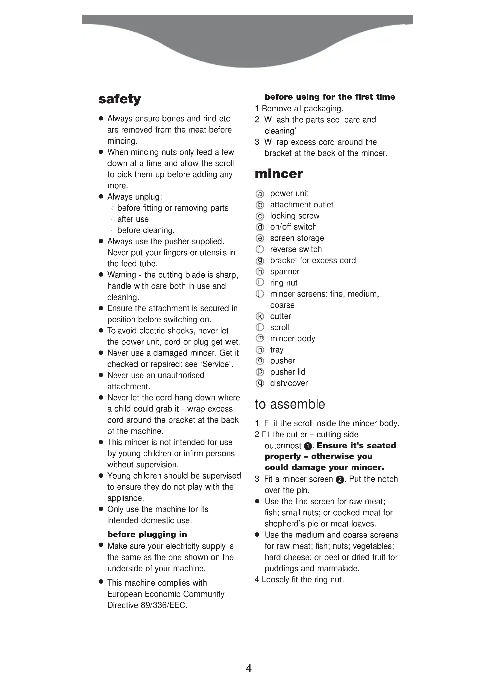 This machine complies with European Economic Community Directive 89/336/EEC. before using for the first time 1 Remove all packaging. 2Wash the parts see ‘care and cleaning’ 3Wrap excess cord around the bracket at the back of the mincer. mincer power unit attachment outlet locking screw on/off switch screen storage reverse switch bracket for excess cord spanner ring nut mincer screens: fine, medium, coarse cutter scroll mincer body tray pusher pusher lid dish/cover to assemble 1Fit the scroll inside the mincer body. 2 Fit the cutter – cutting side outermost . Ensure it’s seated properly – otherwise you could damage your mincer. 3 Fit a mincer screen . Put the notch over the pin.