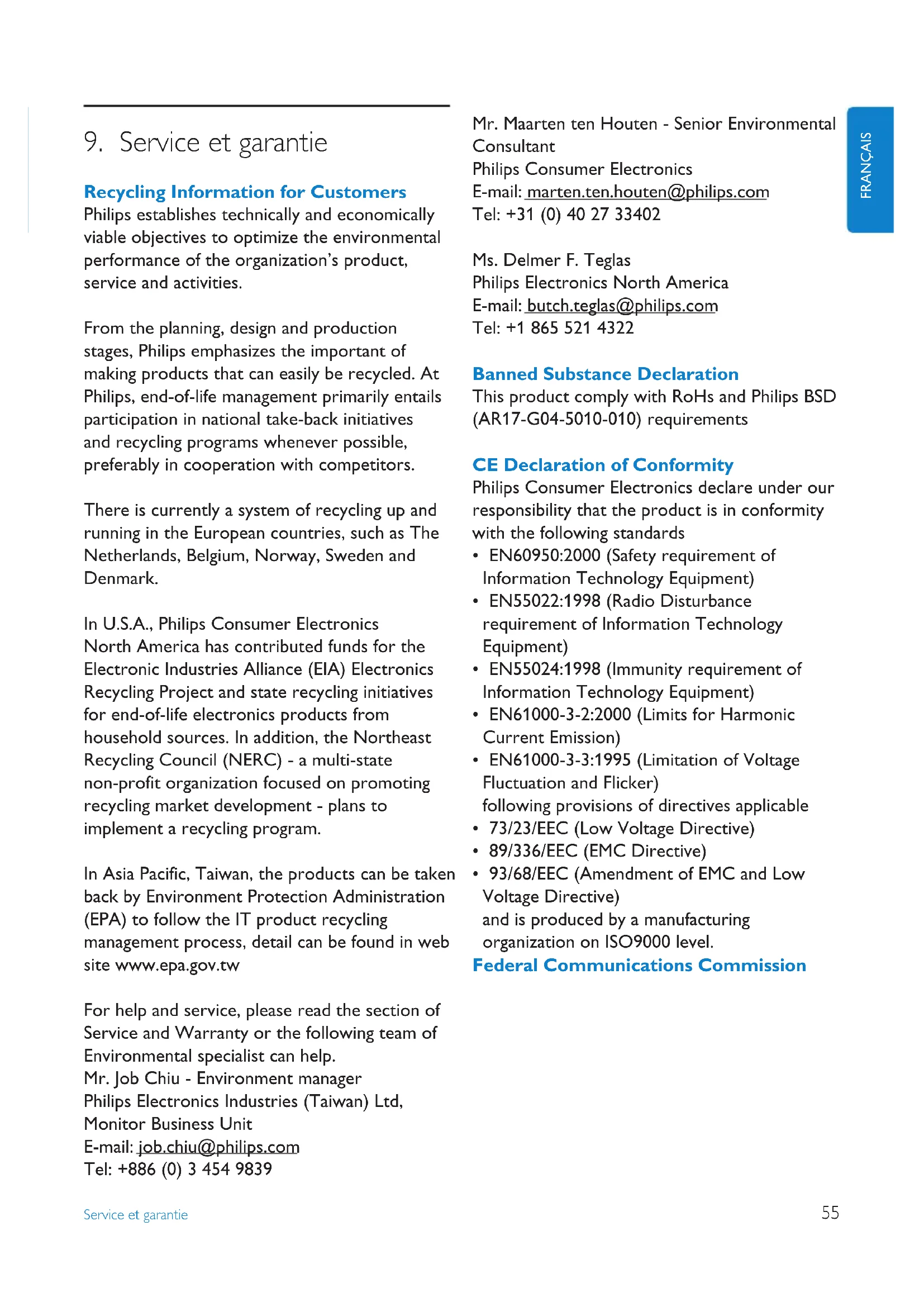 Foire aux questions9. Service et garantie Recycling Information for Customers Philips establishes technically and economically viable objectives to optimize the environmental performance of the organization’s product, service and activities. From the planning, design and production stages, Philips emphasizes the important of making products that can easily be recycled. At Philips, end-of-life management primarily entails participation in national take-back initiatives and recycling programs whenever possible, preferably in cooperation with competitors. There is currently a system of recycling up and running in the European countries, such as The Netherlands, Belgium, Norway, Sweden and Denmark. In U.S.A., Philips Consumer Electronics North America has contributed funds for the Electronic Industries Alliance (EIA) Electronics Recycling Project and state recycling initiatives for end-of-life electronics products from household sources. In addition, the Northeast Recycling Council (NERC) - a multi-state non-profit organization focused on promoting recycling market development - plans to implement a recycling program. In Asia Pacific, Taiwan, the products can be taken back by Environment Protection Administration (EPA) to follow the IT product recycling management process, detail can be found in web site www.epa.gov.tw For help and service, please read the section of Service and Warranty or the following team of Environmental specialist can help. Mr. Job Chiu - Environment manager Philips Electronics Industries (Taiwan) Ltd, Monitor Business Unit E-mail: job.chiu@philips.com Tel: +886 (0) 3 454 9839 Mr. Maarten ten Houten - Senior Environmental Consultant Philips Consumer Electronics E-mail: marten.ten.houten@philips.com Tel: +31 (0) 40 27 33402 Ms. Delmer F. Teglas Philips Electronics North America E-mail: butch.teglas@philips.com Tel: +1 865 521 4322 Banned Substance Declaration This product comply with RoHs and Philips BSD (AR17-G04-5010-010) requirements CE Declaration of Conformity Philips Consumer Electronics declare under our responsibility that the product is in conformity with the following standards