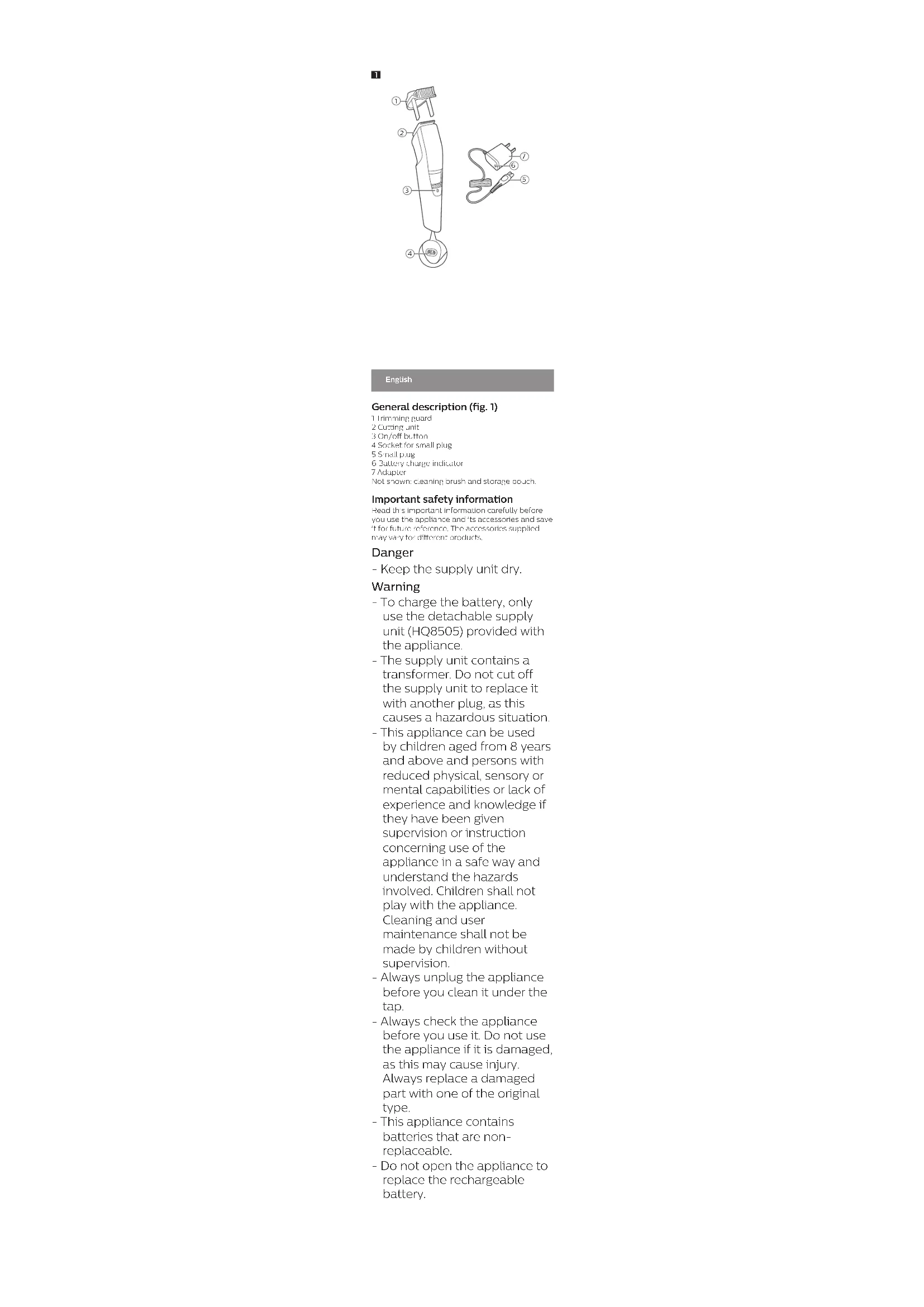 >75 % recycled paper>75 % papier recycléEnglish General description (fig. 1) 1 Trimming guard 2 Cutting unit 3 On/off button 4 Socket for small plug 5 Small plug 6 Battery charge indicator 7 Adapter Not shown: cleaning brush and storage pouch. Important safety information Read this important information carefully before you use the appliance and its accessories and save it for future reference. The accessories supplied may vary for different products. Danger - Keep the supply unit dry. Warning - To charge the battery, only use the detachable supply unit (HQ8505) provided with the appliance. - The supply unit contains a transformer. Do not cut off the supply unit to replace it with another plug, as this causes a hazardous situation. - This appliance can be used by children aged from 8 years and above and persons with reduced physical, sensory or mental capabilities or lack of experience and knowledge if they have been given supervision or instruction concerning use of the appliance in a safe way and understand the hazards involved. Children shall not play with the appliance. Cleaning and user maintenance shall not be made by children without supervision. - Always unplug the appliance before you clean it under the tap. - Always check the appliance before you use it. Do not use the appliance if it is damaged, as this may cause injury. Always replace a damaged part with one of the original type. - This appliance contains batteries that are non- replaceable. - Do not open the appliance to replace the rechargeable battery.