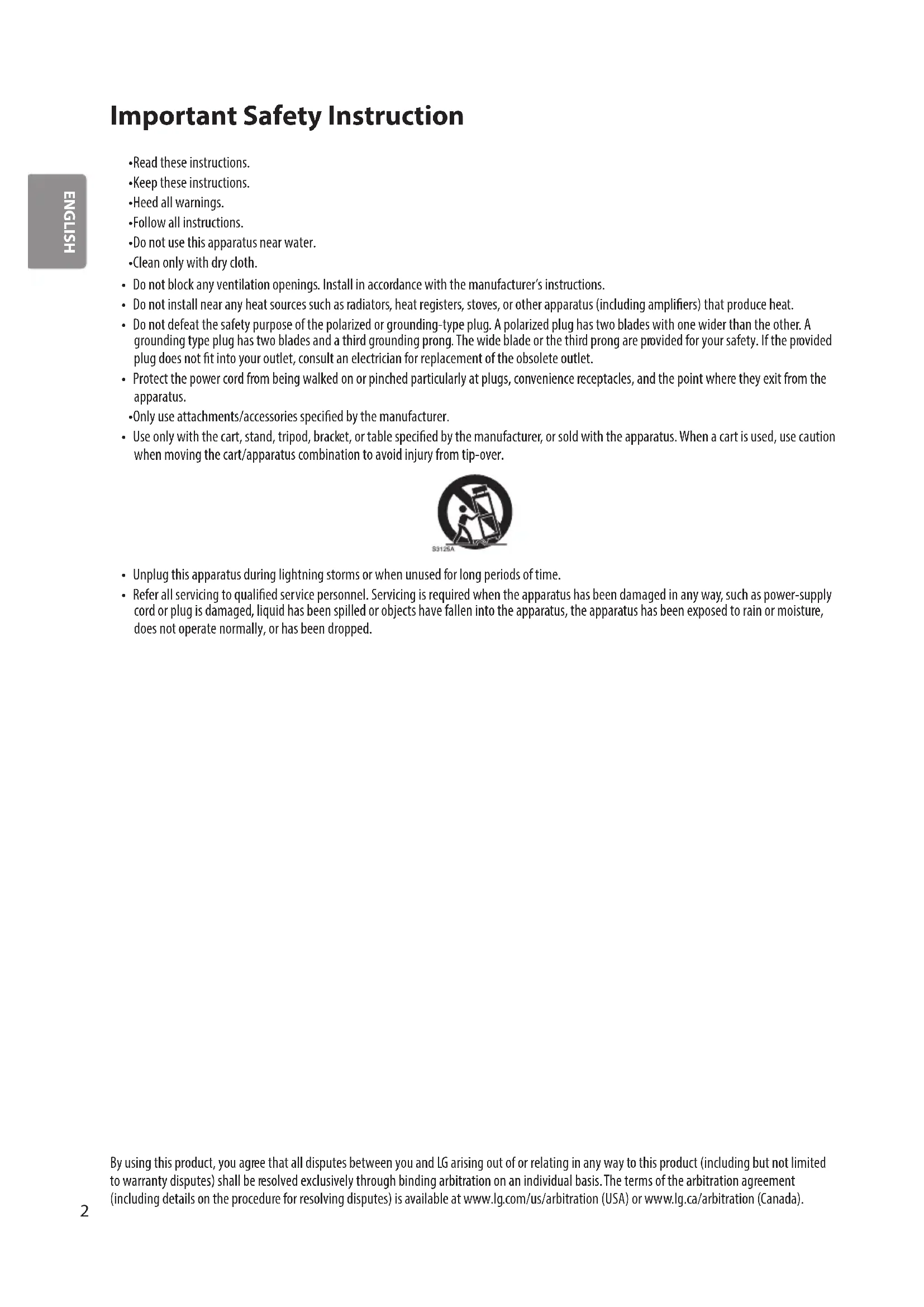 - Refer all servicing to qualied service personnel. Servicing is required when the apparatus has been damaged in any way, such as power-supply cord or plug is damaged, liquid has been spilled or objects have fallen into the apparatus, the apparatus has been exposed to rain or moisture, does not operate normally, or has been dropped. By using this product, you agree that all disputes between you and LG arising out of or relating in any way to this product (including but not limited to warranty disputes) shall be resolved exclusively through binding arbitration on an individual basis. The terms of the arbitration agreement (including details on the procedure for resolving disputes) is available at www.lg.com/us/arbitration (USA) or www.lg.ca/arbitration (Canada).ENGLISH