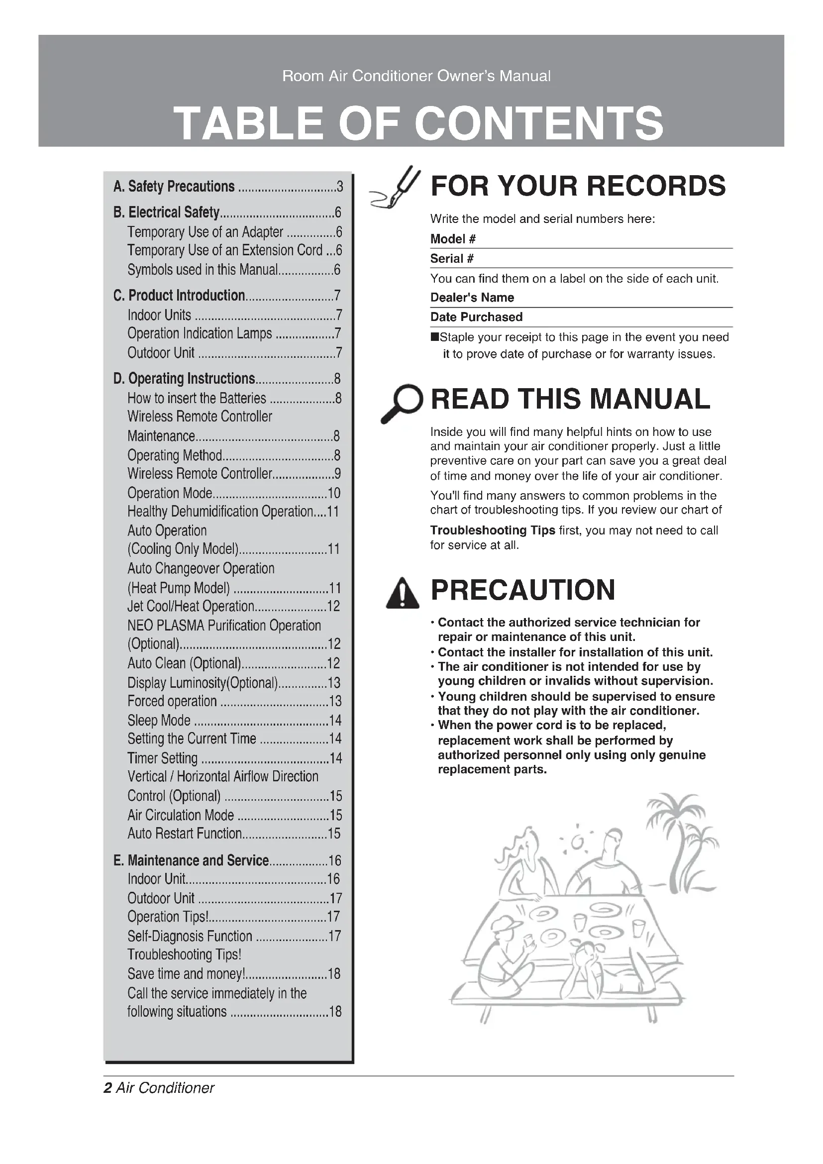 Inside you will find many helpful hints on how to use and maintain your air conditioner properly. Just a little preventive care on your part can save you a great deal of time and money over the life of your air conditioner. You'll find many answers to common problems in the chart of troubleshooting tips. If you review our chart of Troubleshooting Tips first, you may not need to call for service at all. PRECAUTION