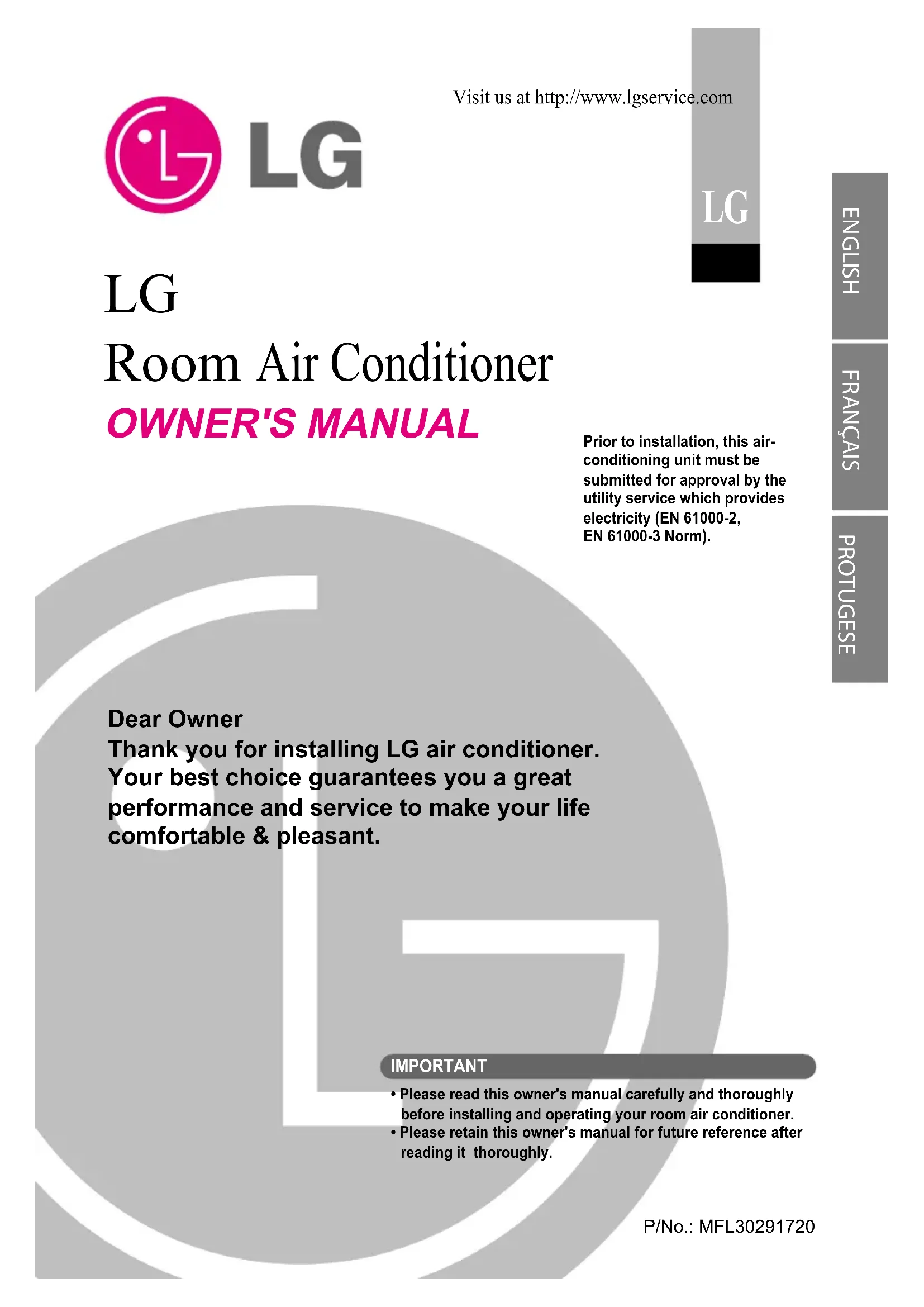 Visit us at http://www.lgservice.comIMPORTANT• Please read this owner's manual carefully and thoroughlybefore installing and operating your room air conditioner.• Please retain this owner's manual for future reference afterreading it thoroughly.Prior to installation, this air-conditioning unit must besubmitted for approval by theutility service which provideselectricity (EN 61000-2,EN 61000-3 Norm). Dear Owner Thank you for installing LG air conditioner. Your best choice guarantees you a great performance and service to make your life comfortable & pleasant. P/No.: MFL30291720