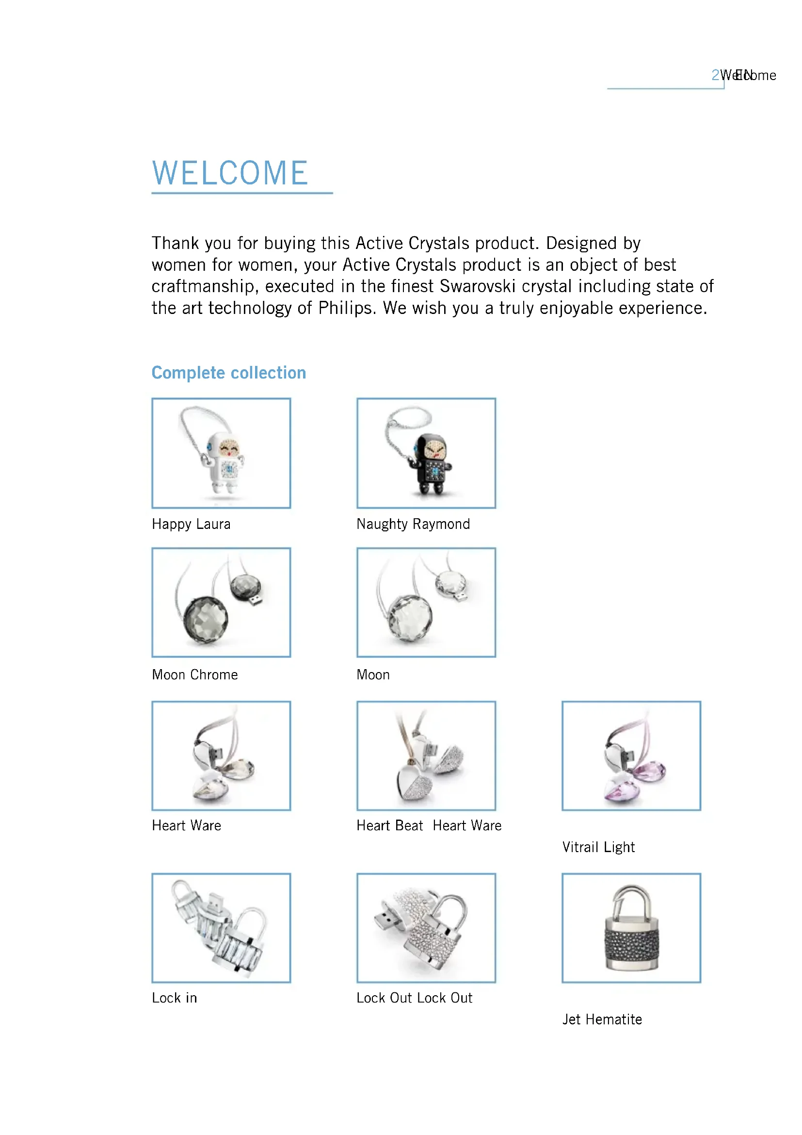 Vista, XP, 2000, or MACOS 9.0 or higher 6 CONNECT 7 Connecting the USB memory key to your computer 7 ENJOY 8 Operating the USB memory key 8 Disconnecting the USB memory key from your computer 8 TECHNICAL SPECIFICATIONS 10 Need help? 10 1Content ENWELCOME Thank you for buying this Active Crystals product. Designed by women for women, your Active Crystals product is an object of best craftmanship, executed in the finest Swarovski crystal including state of the art technology of Philips. We wish you a truly enjoyable experience. Complete collection Heart Ware Lock in Heart Beat Heart Ware Vitrail Light Lock Out Lock Out Jet Hematite