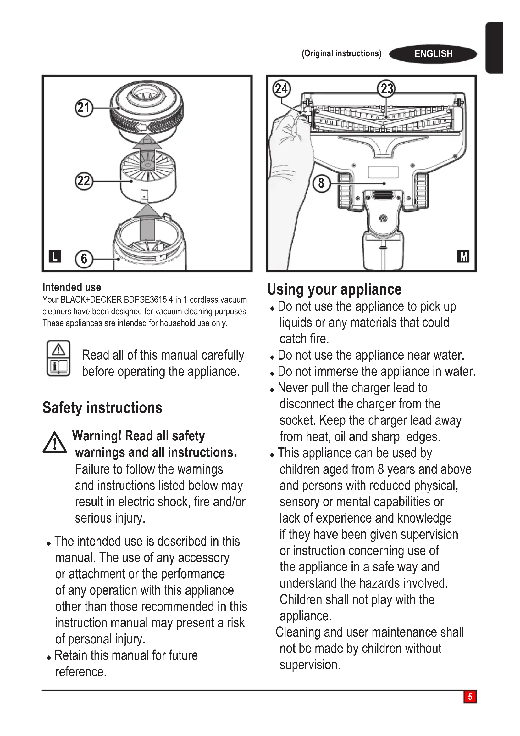 Intended use Your BLACK+DECKER BDPSE3615 4 in 1 cordless vacuum cleaners have been designed for vacuum cleaning purposes. These appliances are intended for household use only. Read all of this manual carefully before operating the appliance. Safety instructions