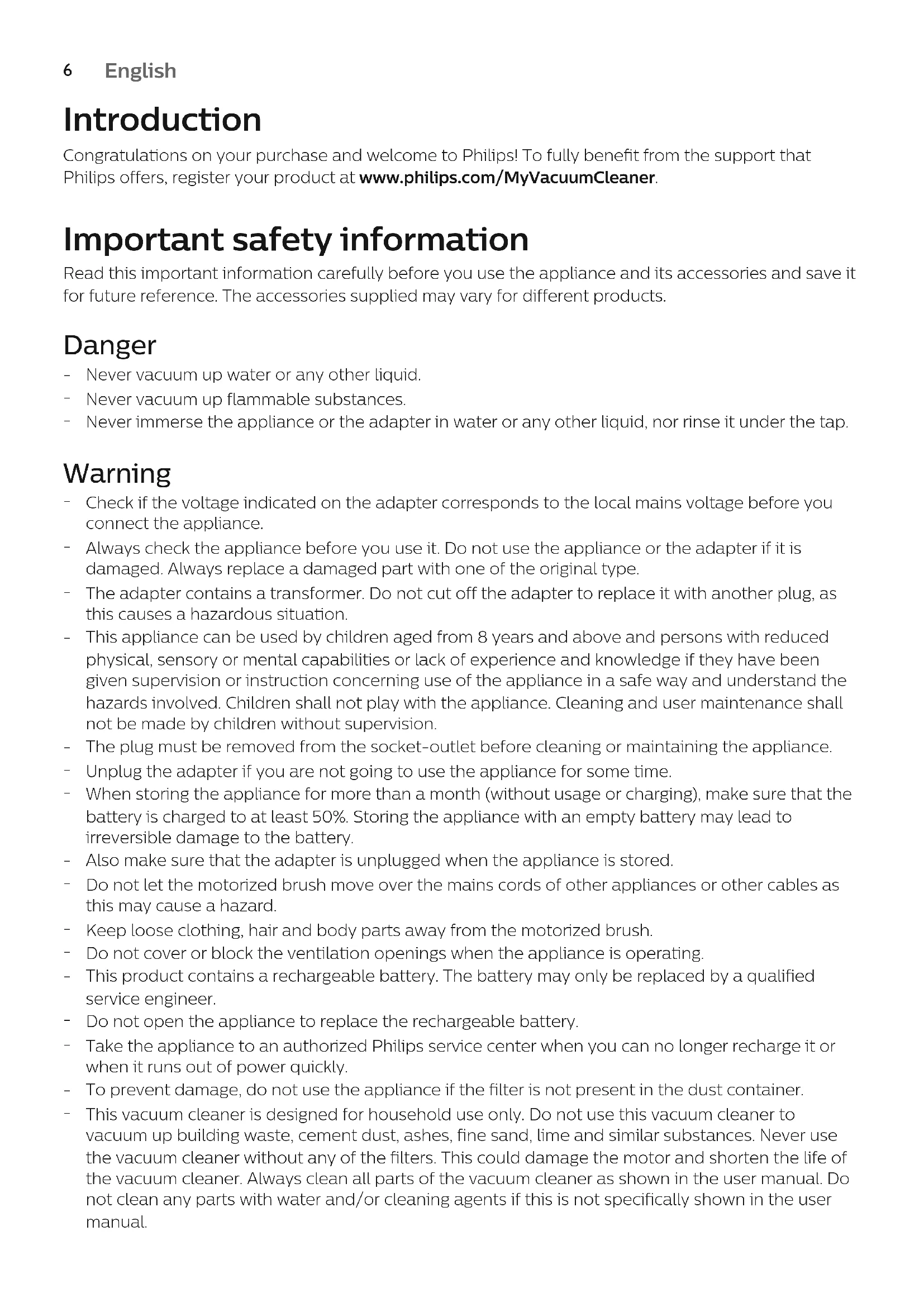 English Introduction Congratulations on your purchase and welcome to Philips! To fully benefit from the support that Philips offers, register your product at www.philips.com/MyVacuumCleaner. Important safety information Read this important information carefully before you use the appliance and its accessories and save it for future reference. The accessories supplied may vary for different products. Danger