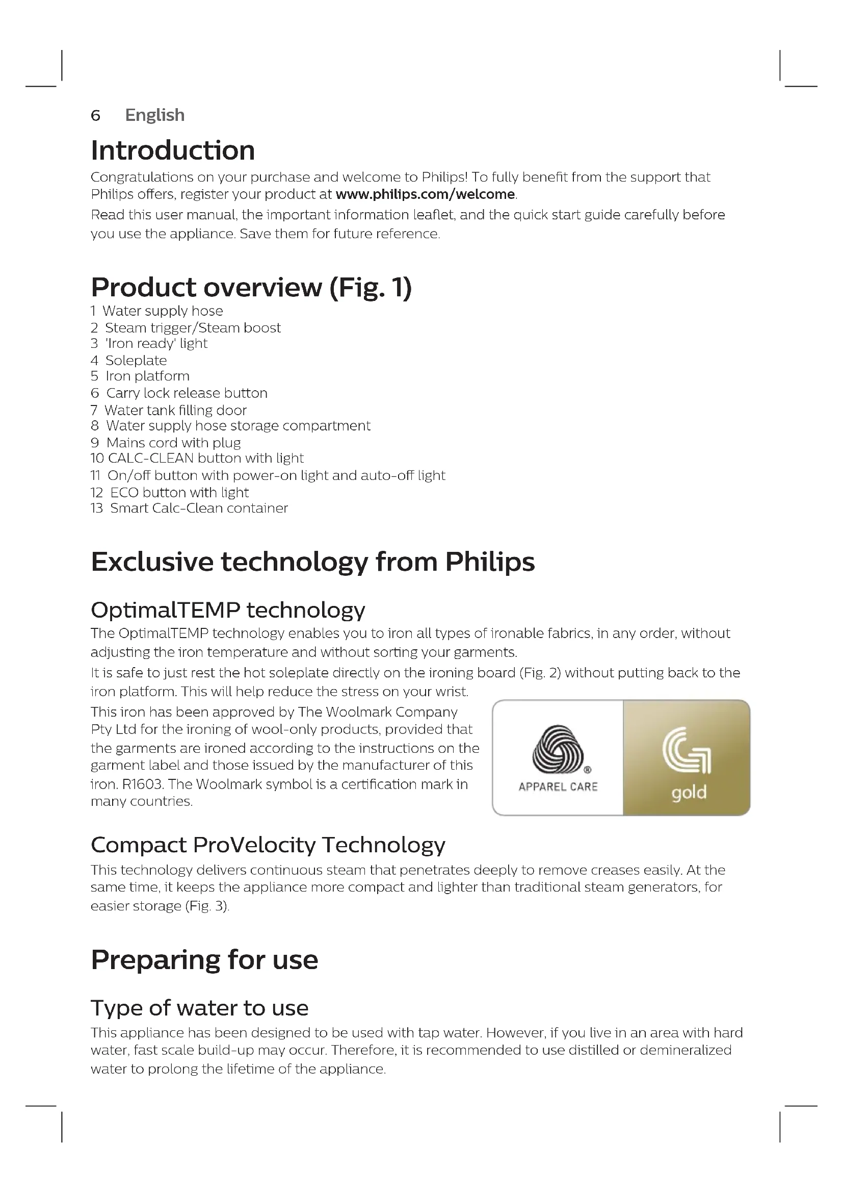 30English 6 Dansk 13 Deutsch 20 Español 27 Français 34 Italiano 41 Nederlands 48 Português 55 Suomi 62 Svenska 696 Introduction Congratulations on your purchase and welcome to Philips! To fully benet from the support that Philips oers, register your product at www.philips.com/welcome. Read this user manual, the important information leaet, and the quick start guide carefully before you use the appliance. Save them for future reference. Product overview (Fig. 1) 1 Water supply hose 2 Steam trigger/Steam boost 3 'Iron ready' light 4 Soleplate 5 Iron platform 6 Carry lock release button 7 Water tank lling door 8 Water supply hose storage compartment 9 Mains cord with plug 10 CALC-CLEAN button with light 11 On/o button with power-on light and auto-o light 12 ECO button with light 13 Smart Calc-Clean container Exclusive technology from Philips OptimalTEMP technology The OptimalTEMP technology enables you to iron all types of ironable fabrics, in any order, without adjusting the iron temperature and without sorting your garments. It is safe to just rest the hot soleplate directly on the ironing board (Fig. 2) without putting back to the iron platform. This will help reduce the stress on your wrist. This iron has been approved by The Woolmark Company Pty Ltd for the ironing of wool-only products, provided that the garments are ironed according to the instructions on the garment label and those issued by the manufacturer of this iron. R1603. The Woolmark symbol is a certication mark in many countries. Compact ProVelocity Technology This technology delivers continuous steam that penetrates deeply to remove creases easily. At the same time, it keeps the appliance more compact and lighter than traditional steam generators, for easier storage (Fig. 3). Preparing for use Type of water to use This appliance has been designed to be used with tap water. However, if you live in an area with hard water, fast scale build-up may occur. Therefore, it is recommended to use distilled or demineralized water to prolong the lifetime of the appliance. English7