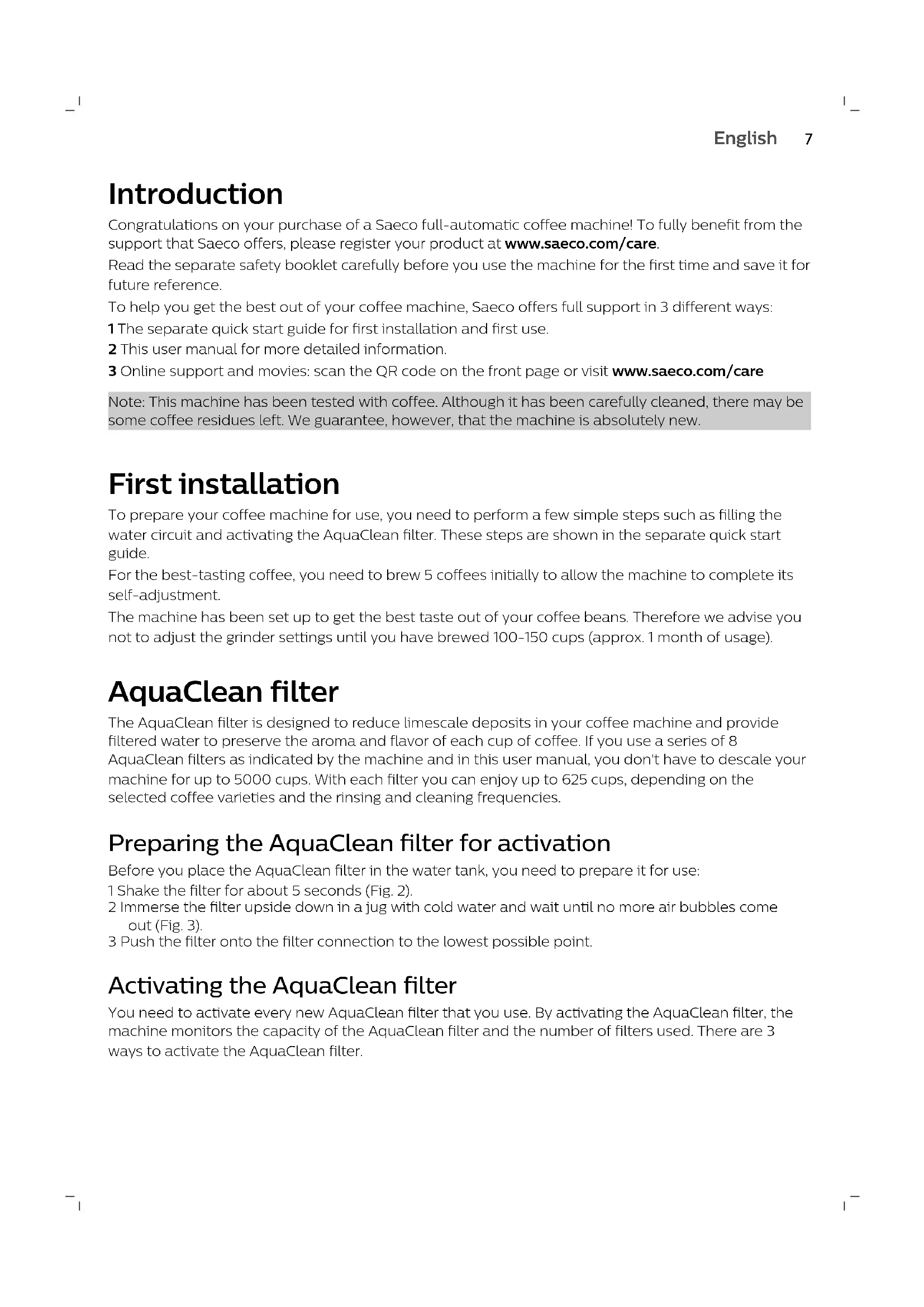 Coffee exit ductIntroduction Congratulations on your purchase of a Saeco full-automatic coffee machine! To fully benefit from the support that Saeco offers, please register your product at www.saeco.com/care. Read the separate safety booklet carefully before you use the machine for the first time and save it for future reference. To help you get the best out of your coffee machine, Saeco offers full support in 3 different ways: 1 The separate quick start guide for first installation and first use. 2 This user manual for more detailed information. 3 Online support and movies: scan the QR code on the front page or visit www.saeco.com/care Note: This machine has been tested with coffee. Although it has been carefully cleaned, there may be some coffee residues left. We guarantee, however, that the machine is absolutely new. First installation To prepare your coffee machine for use, you need to perform a few simple steps such as filling the water circuit and activating the AquaClean filter. These steps are shown in the separate quick start guide. For the best-tasting coffee, you need to brew 5 coffees initially to allow the machine to complete its self-adjustment. The machine has been set up to get the best taste out of your coffee beans. Therefore we advise you not to adjust the grinder settings until you have brewed 100-150 cups (approx. 1 month of usage). AquaClean filter The AquaClean filter is designed to reduce limescale deposits in your coffee machine and provide filtered water to preserve the aroma and flavor of each cup of coffee. If you use a series of 8 AquaClean filters as indicated by the machine and in this user manual, you don't have to descale your machine for up to 5000 cups. With each filter you can enjoy up to 625 cups, depending on the selected coffee varieties and the rinsing and cleaning frequencies. Preparing the AquaClean filter for activation Before you place the AquaClean filter in the water tank, you need to prepare it for use: 1 Shake the filter for about 5 seconds (Fig. 2). 2 Immerse the filter upside down in a jug with cold water and wait until no more air bubbles come out (Fig. 3). 3 Push the filter onto the filter connection to the lowest possible point. Activating the AquaClean filter You need to activate every new AquaClean filter that you use. By activating the AquaClean filter, the machine monitors the capacity of the AquaClean filter and the number of filters used. There are 3 ways to activate the AquaClean filter.