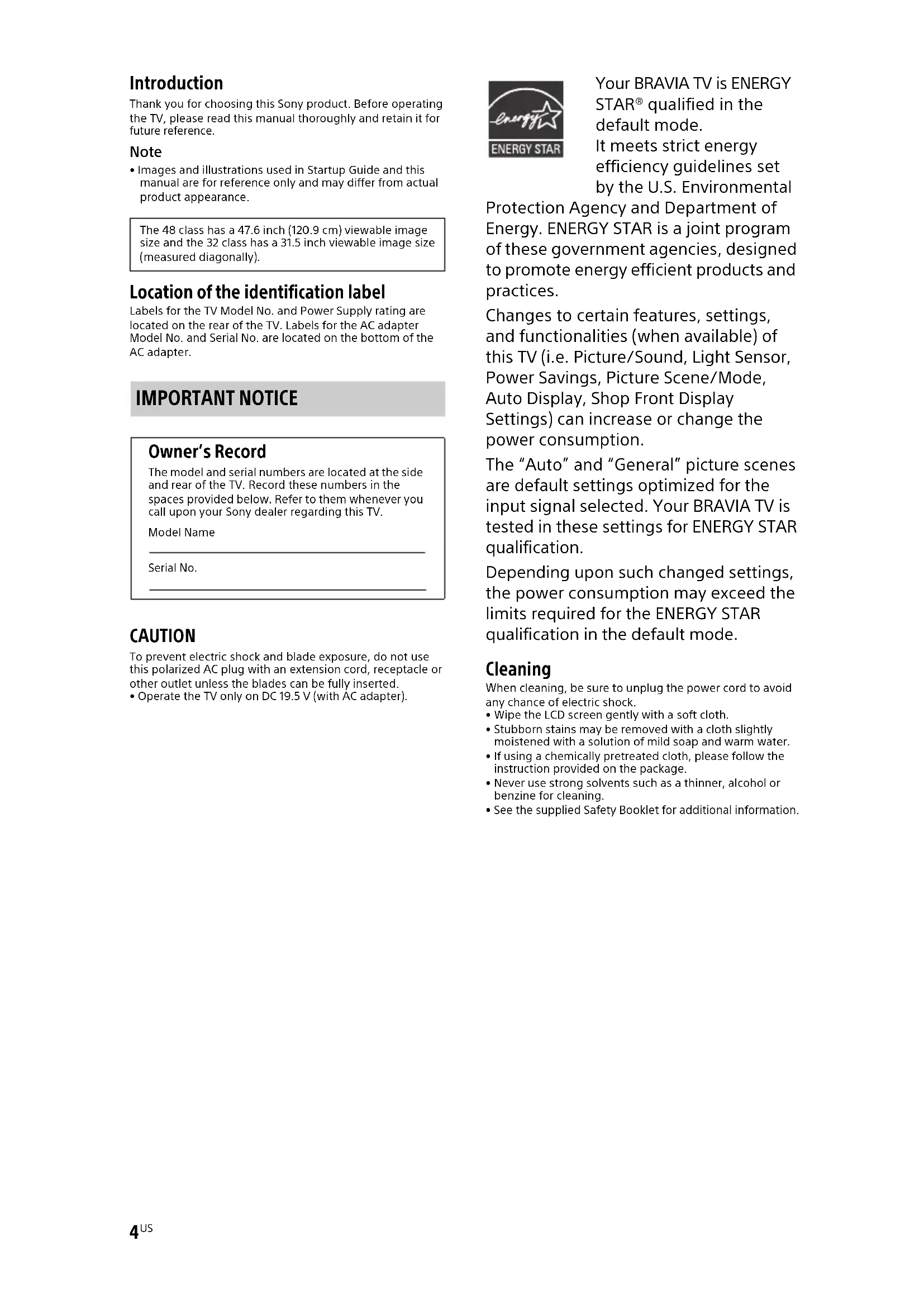 - Operate the TV only on DC 19.5 V (with AC adapter). Your BRAVIA TV is ENERGY STAR® qualified in the default mode. It meets strict energy efficiency guidelines set by the U.S. Environmental Protection Agency and Department of Energy. ENERGY STAR is a joint program of these government agencies, designed to promote energy efficient products and practices. Changes to certain features, settings, and functionalities (when available) of this TV (i.e. Picture/Sound, Light Sensor, Power Savings, Picture Scene/Mode, Auto Display, Shop Front Display Settings) can increase or change the power consumption. The “Auto” and “General” picture scenes are default settings optimized for the input signal selected. Your BRAVIA TV is tested in these settings for ENERGY STAR qualification. Depending upon such changed settings, the power consumption may exceed the limits required for the ENERGY STAR qualification in the default mode. Cleaning When cleaning, be sure to unplug the power cord to avoid any chance of electric shock.